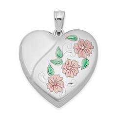 Sterling Silver Rhodium-plated 24mm Enameled, D/C Floral Heart Locket