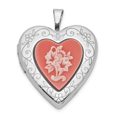 Sterling Silver 20mm Polished Pink Resin Cameo Flower Heart Locket