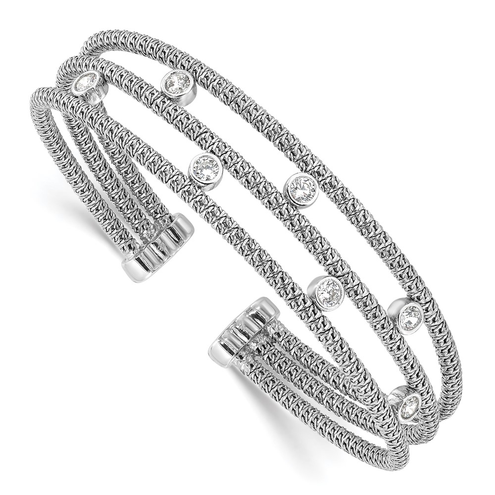 Sterling Silver Polished Rhodium-plated Textured 3 Band CZ Cuff Bracelet