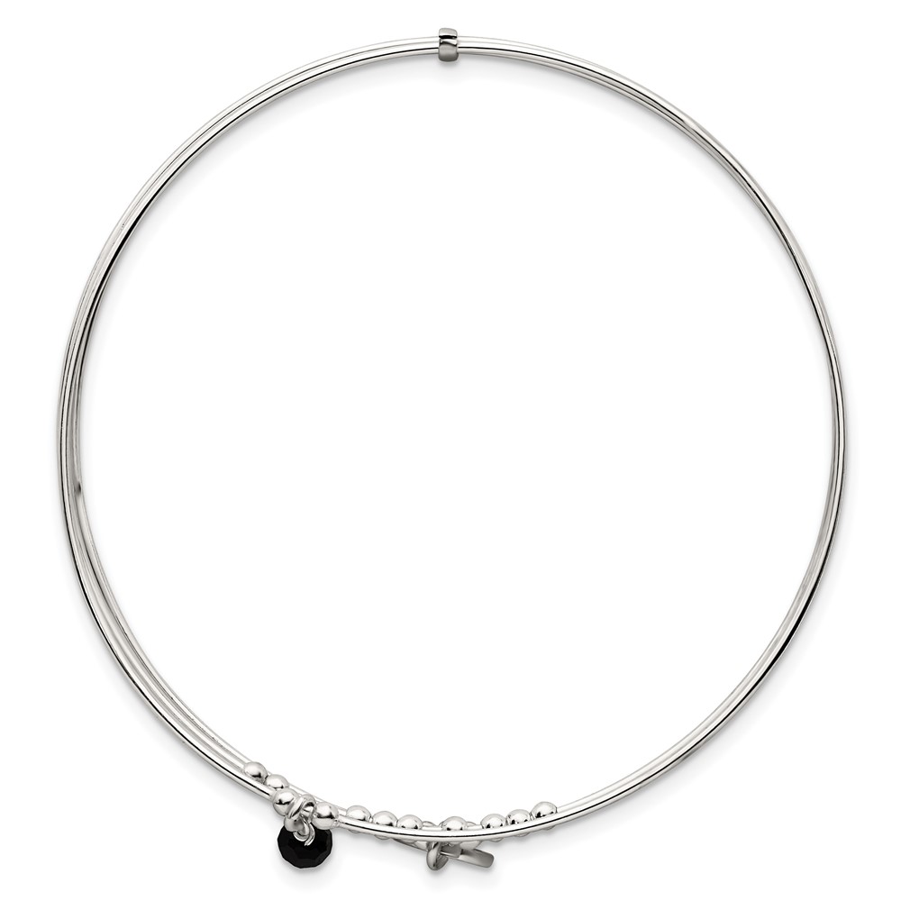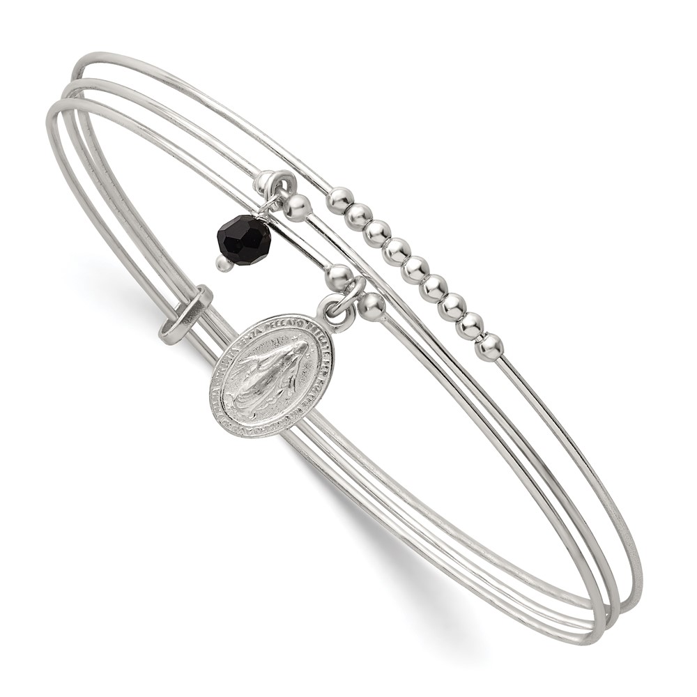 Sterling Silver Polished Beaded Miraculous Medal and Black Glass Bead Triple Band Slip-on Bangle Bracelet