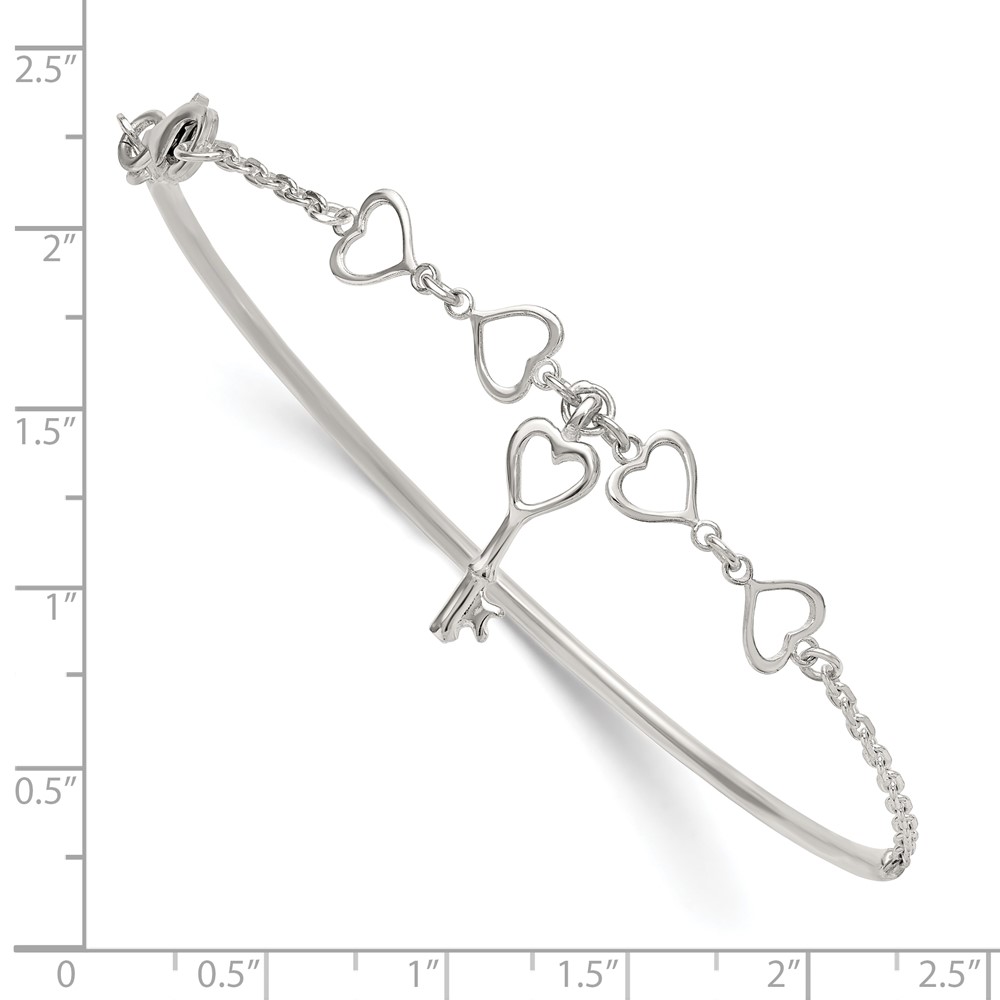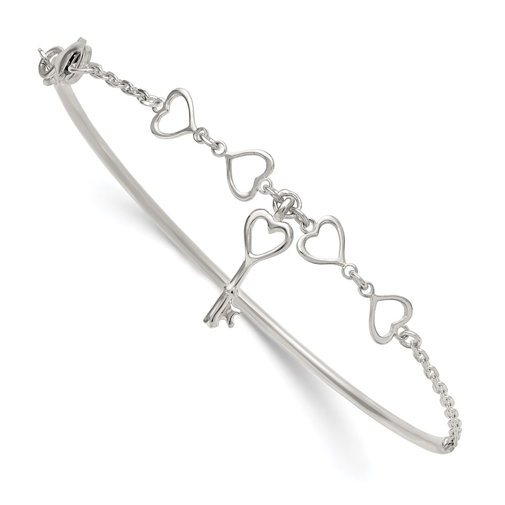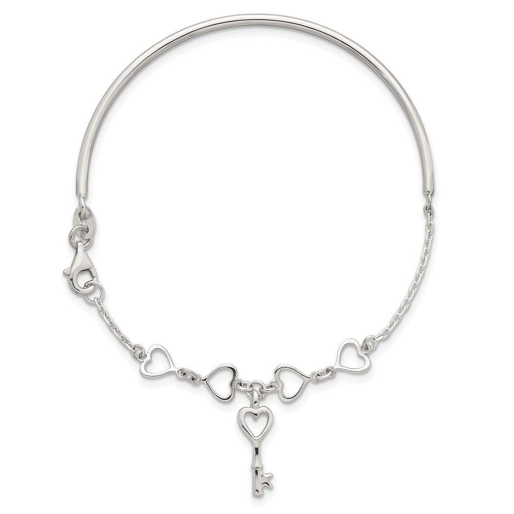 Sterling Silver Polished Open Hearts and Key Charms Half Bangle Bracelet
