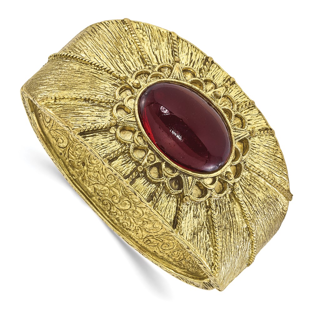 1928 Brass-tone Red Acrylic Stone Hinged Cuff Bangle