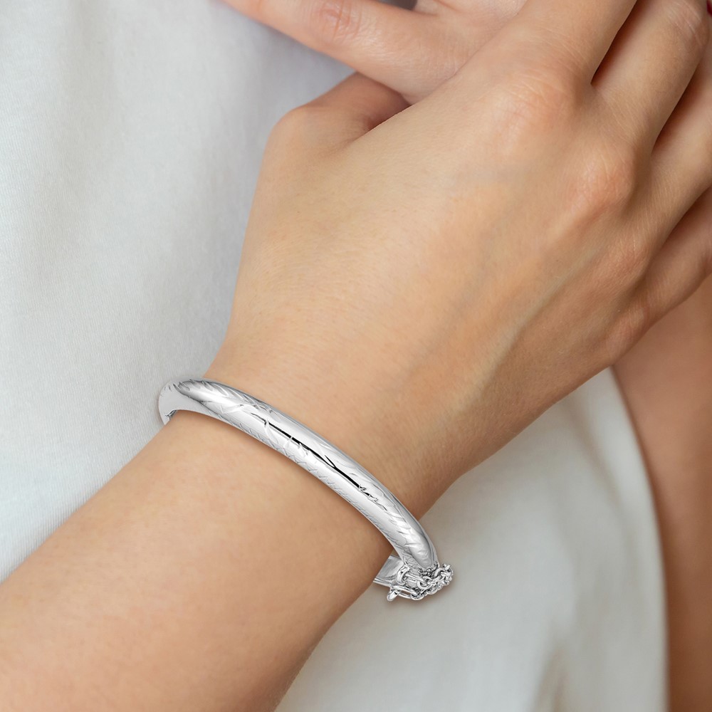 Sterling Silver Rhodium-plated Polished & Diamond-cut 5mm with Safety Clasp Hinged Children's Bangle