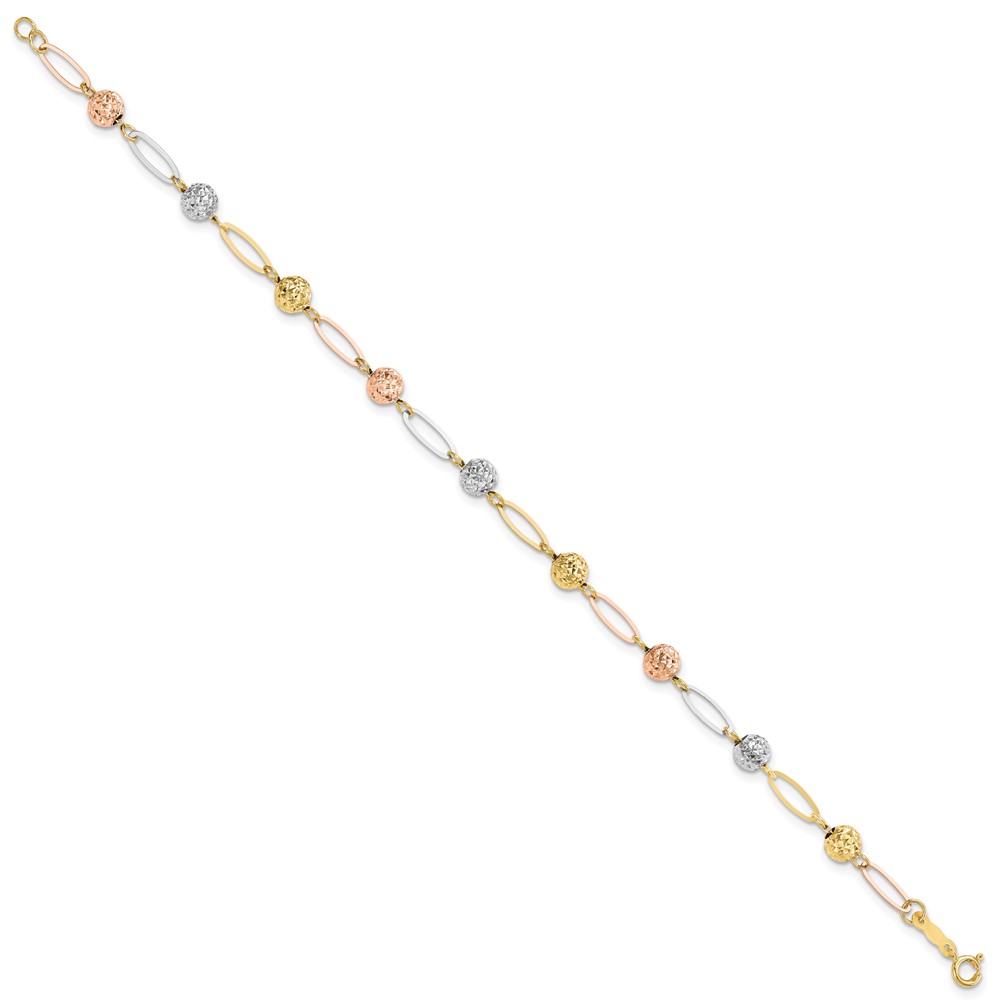 14K Tri-Color Polished Diamond-cut Beads and Oval Link 7 inch Bracelet