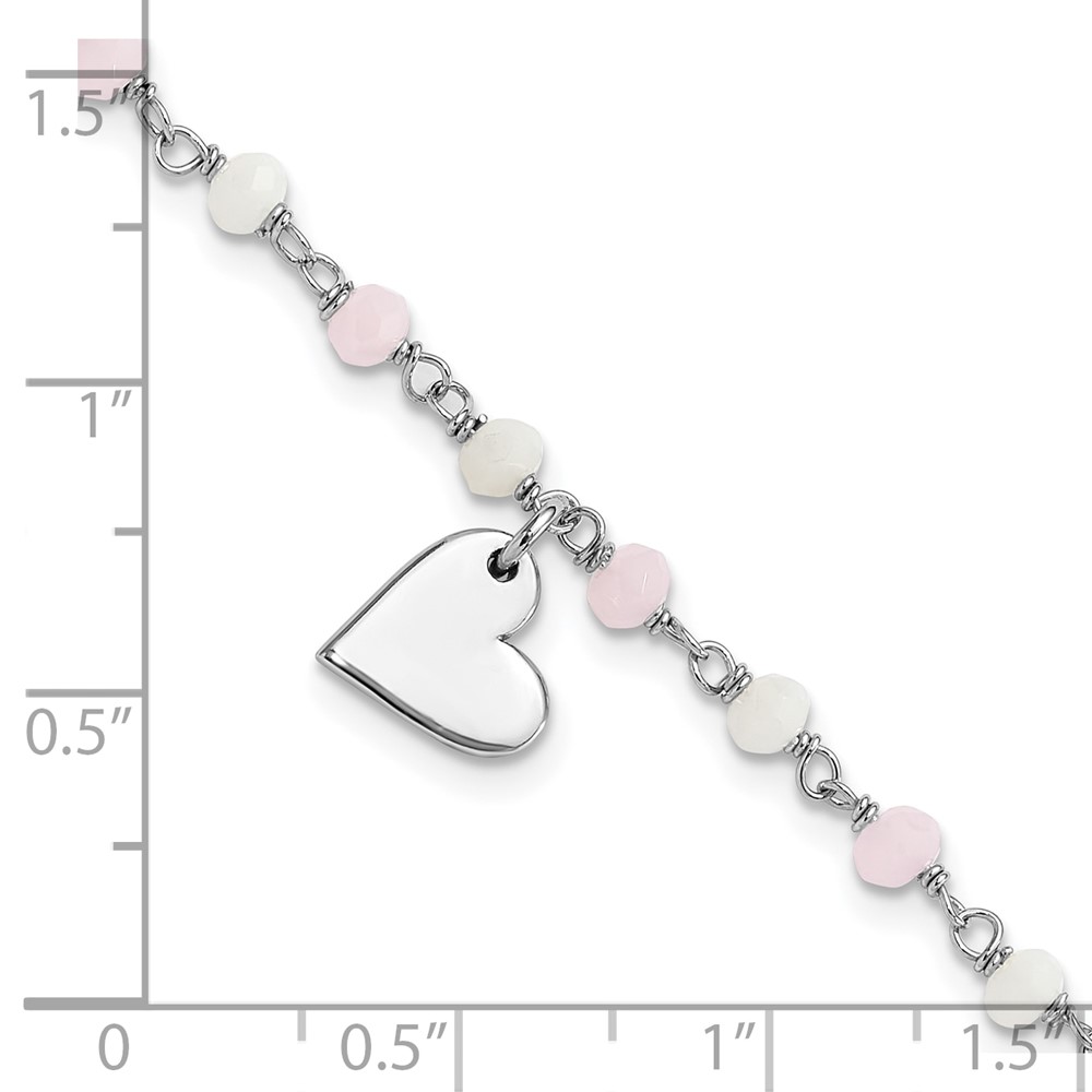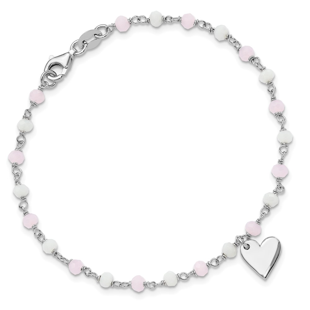 Sterling Silver Rhod-plated Heart Pink/White Glass Beads 7.5in Bracelet