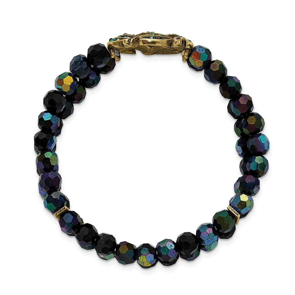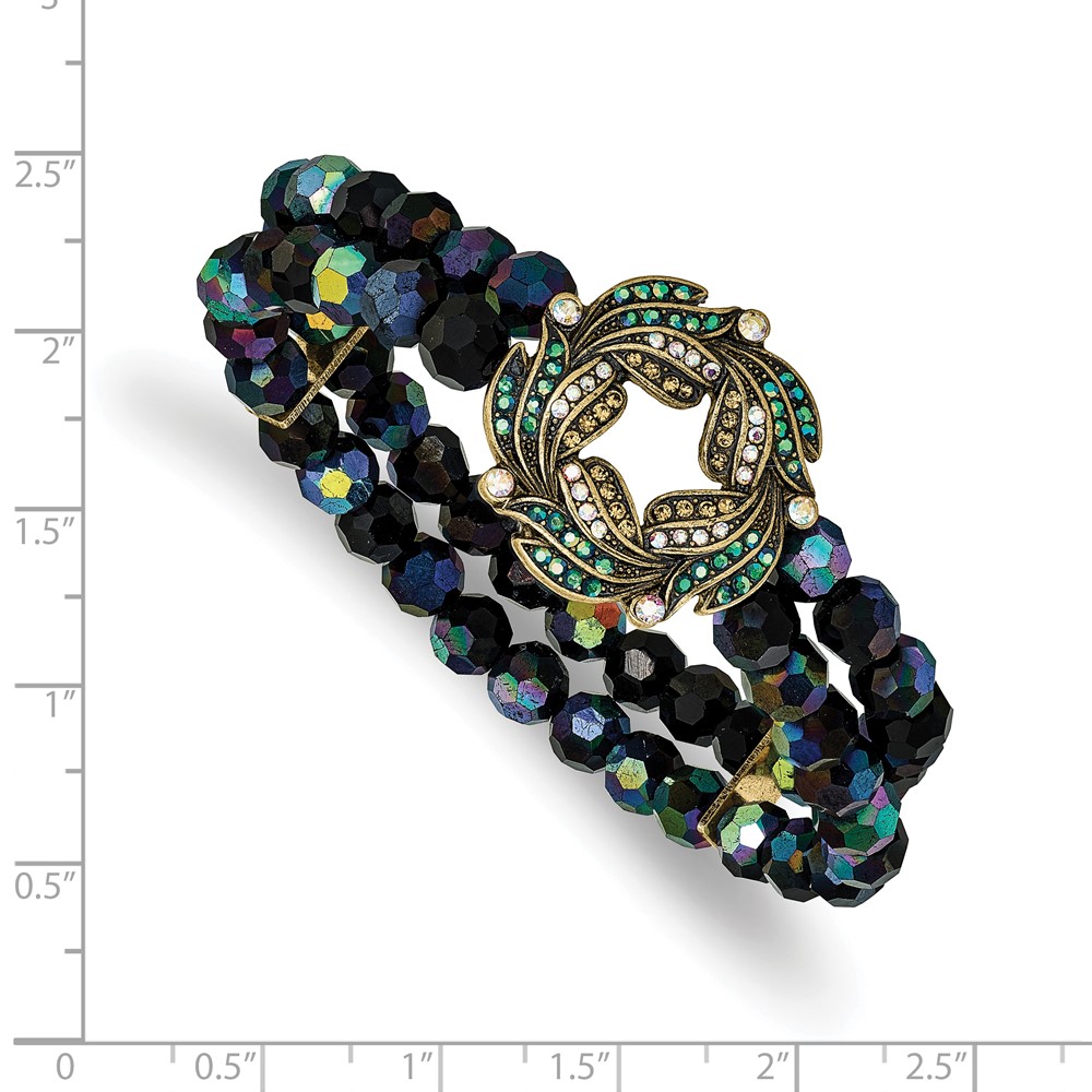 1928 Gold-tone Blue Iridescent Aurora Borealis Glass Wreath and Black Bead Bracelet