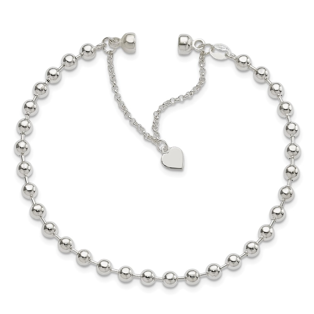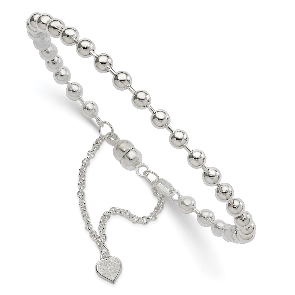 Sterling Silver Polished 4MM Beaded Dangling Heart 7.5 inch Charm Bracelet with Magnetic Clasp