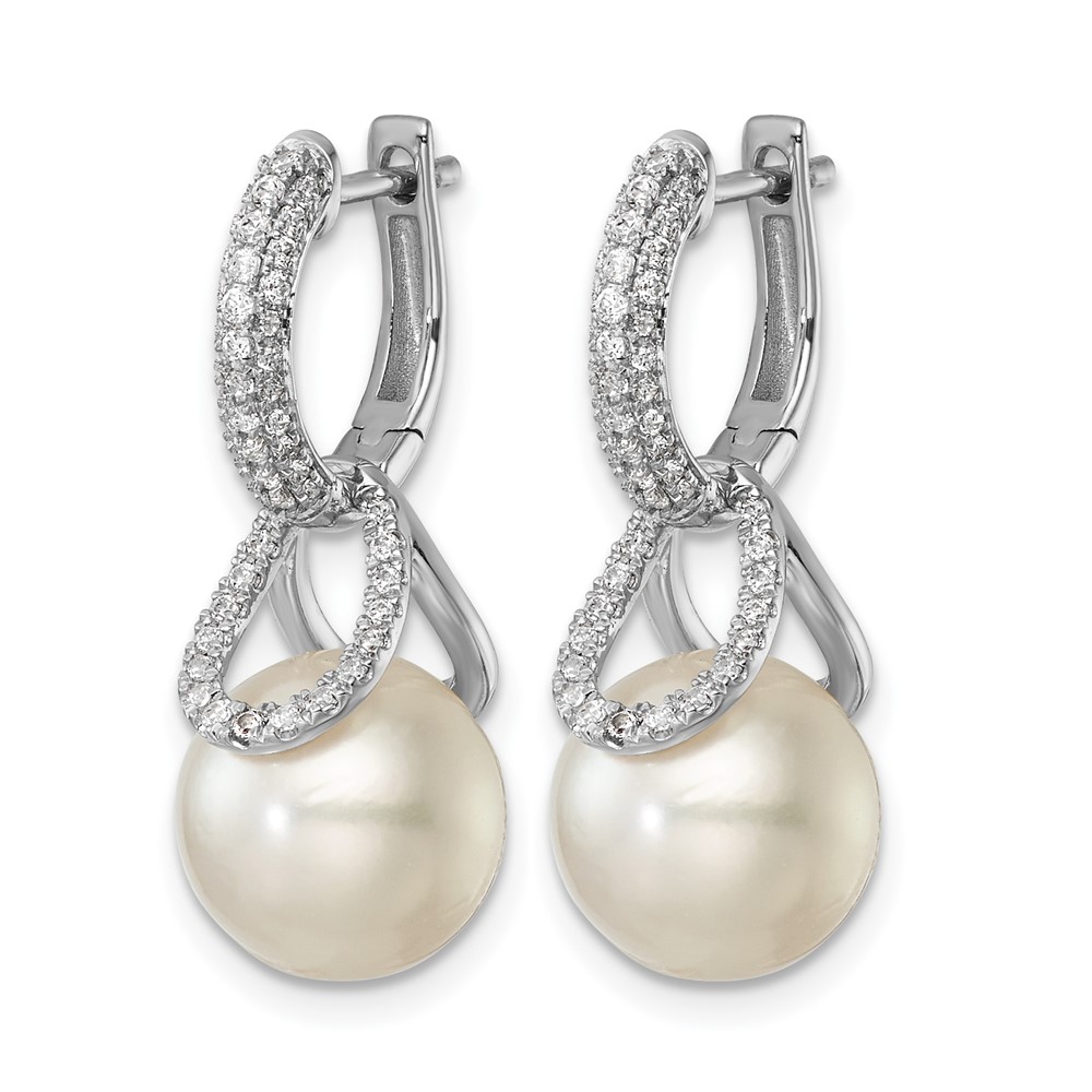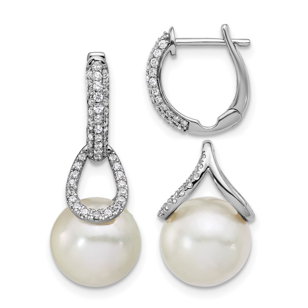 14K White Gold 10-11 White Round Freshwater Cultured Pearl .41 carat Diamond Hinged Hoop Earrings with Removable Dangles