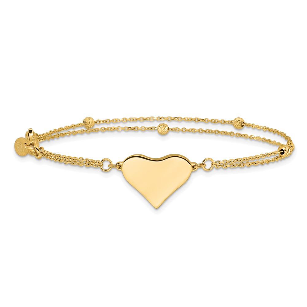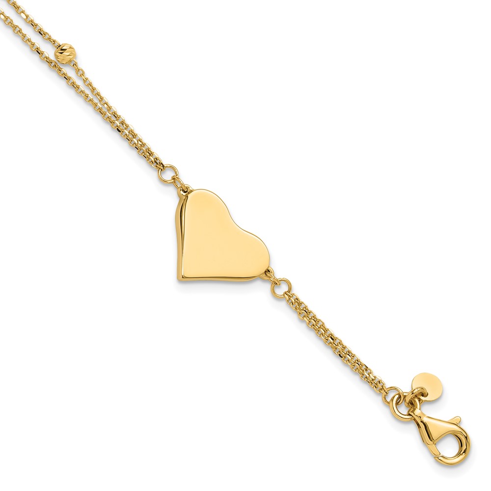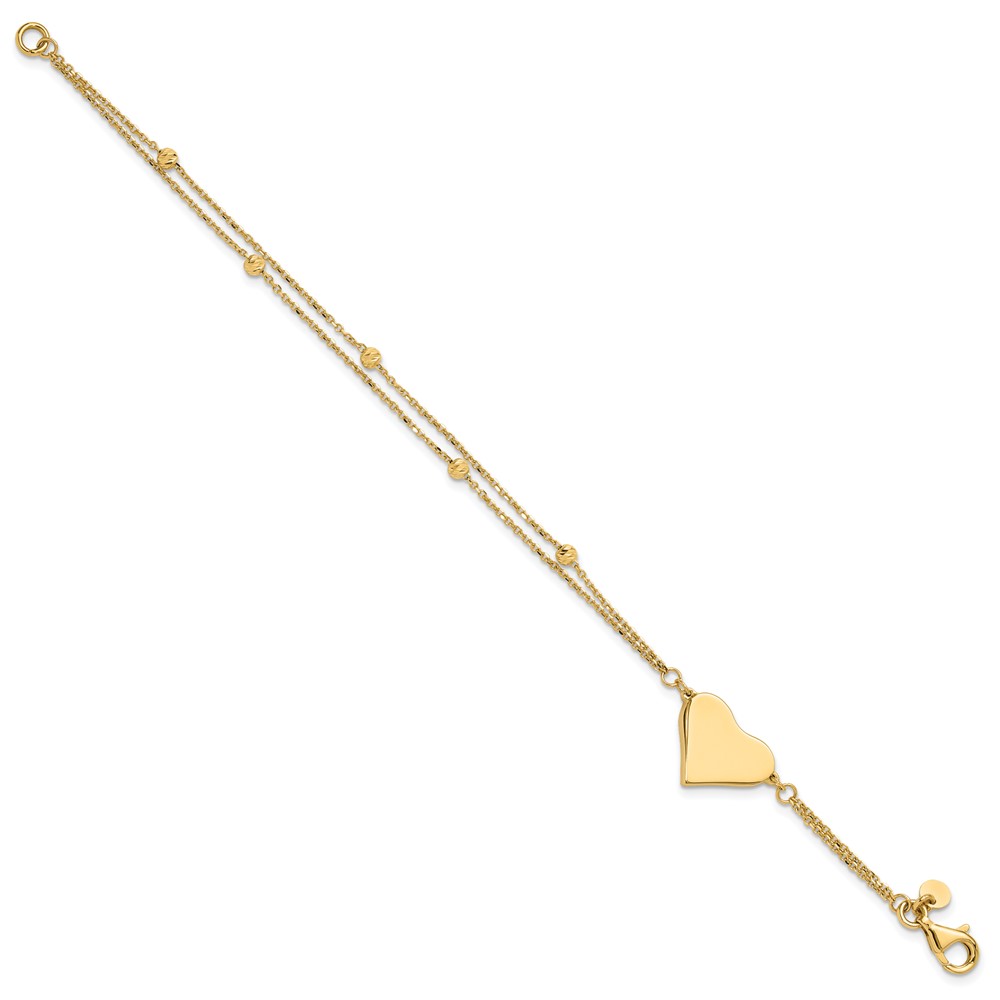 14K Polished 11x18mm Heart and Diamond-cut Beaded 2-Strand 7.5 inch Bracelet