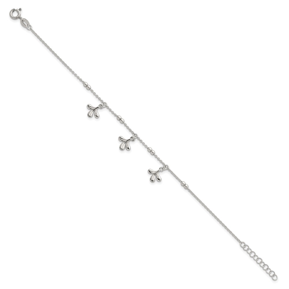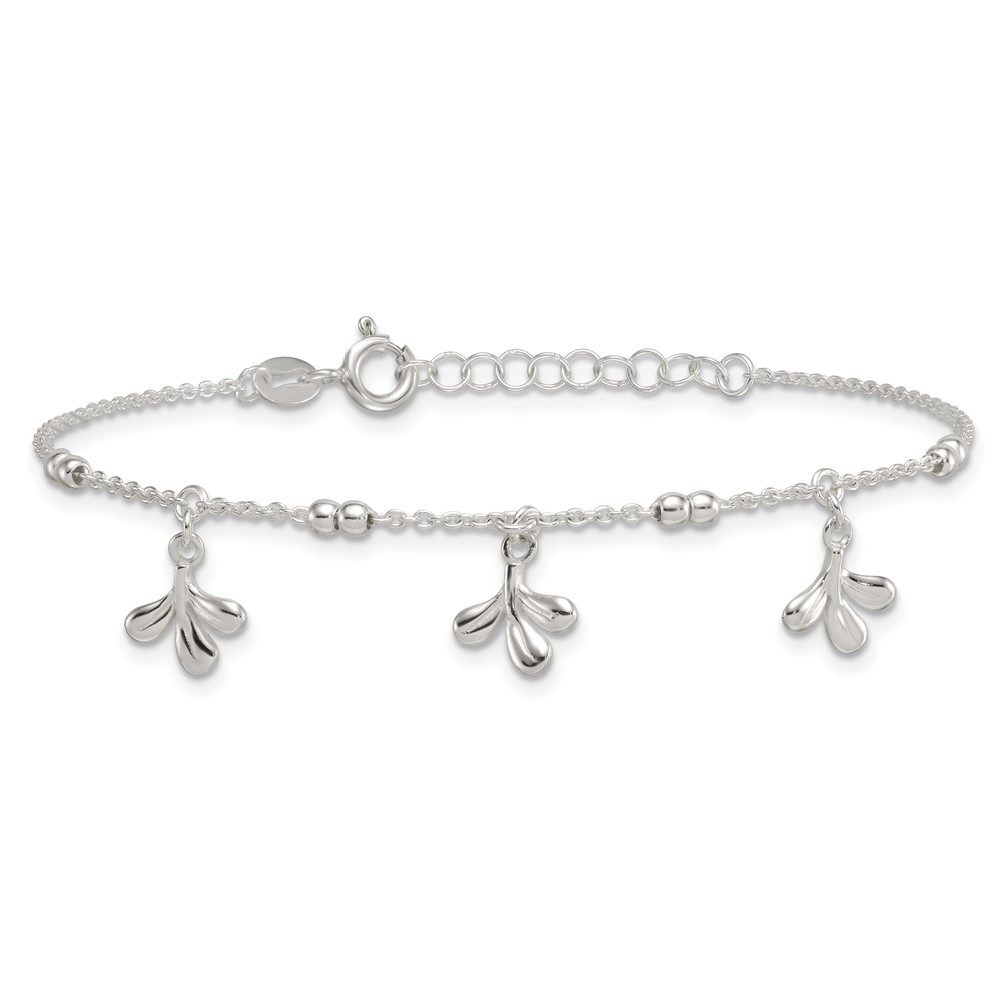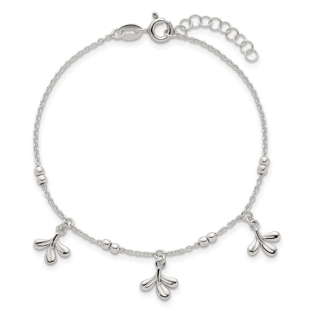 Sterling Silver Polished and Beaded with Three Leaf Dangles 7 inch with 1 inch Extension Bracelet