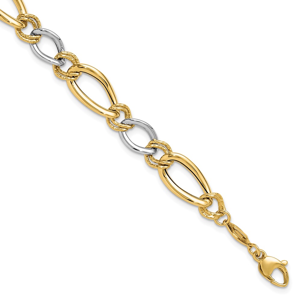 14K Two-tone Polished and Textured Fancy Oval Curb 7.5 inch Bracelet