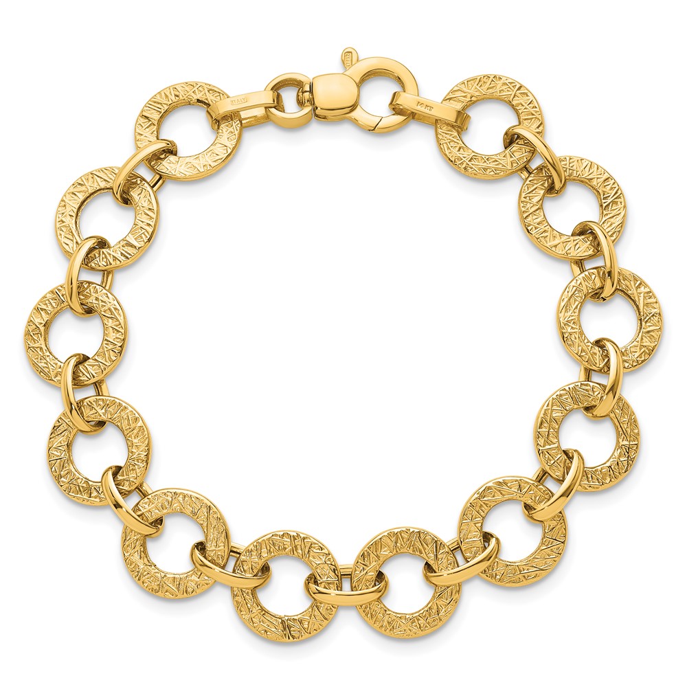 14K Polished and Textured 12mm Fancy Round Link 7 inch Bracelet