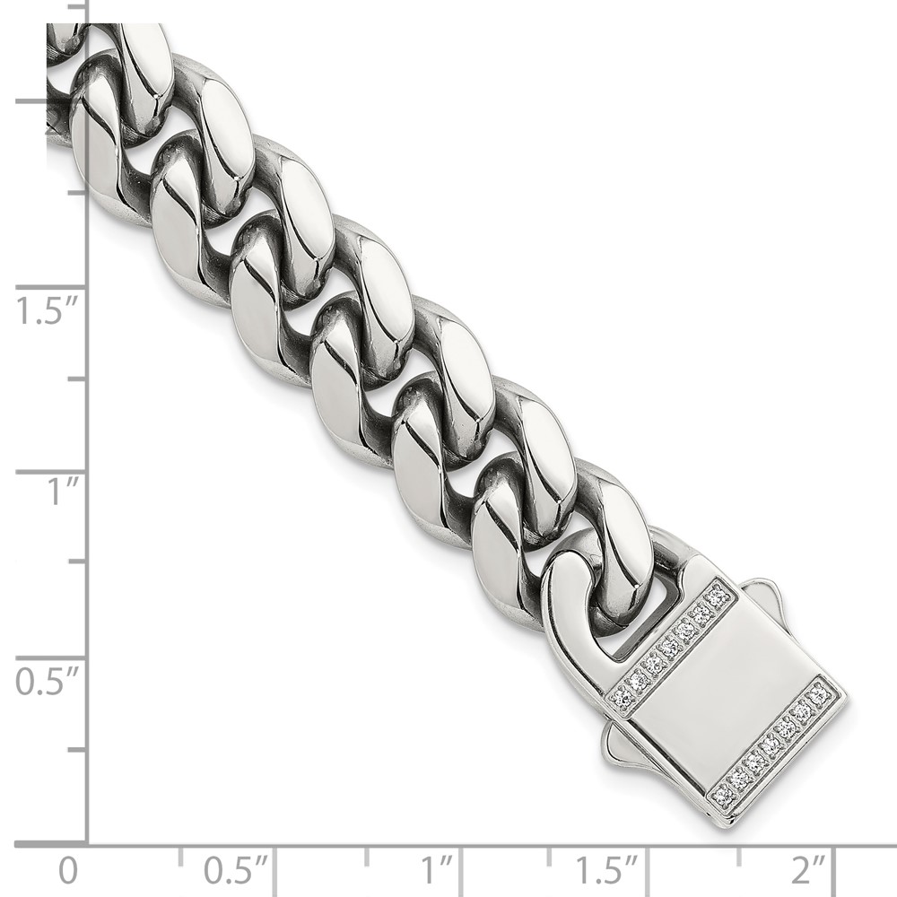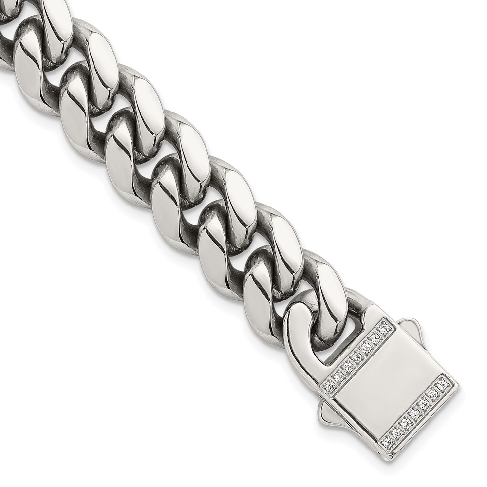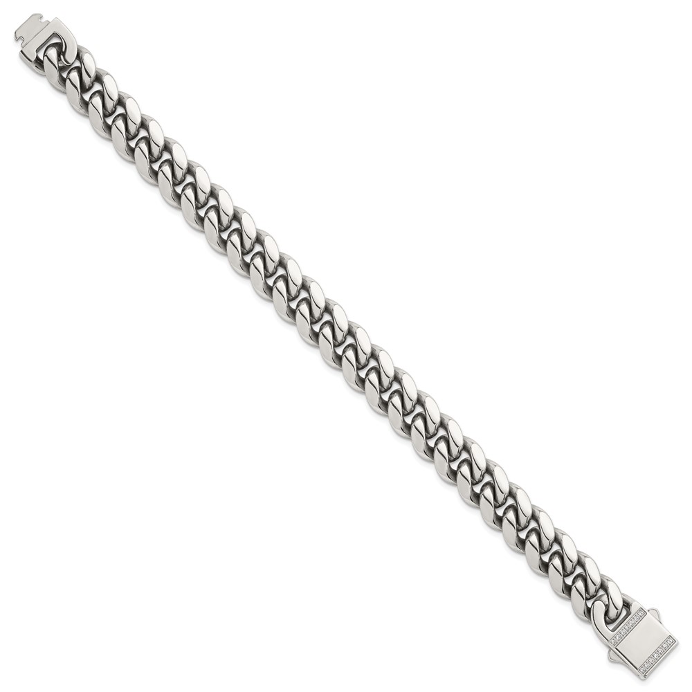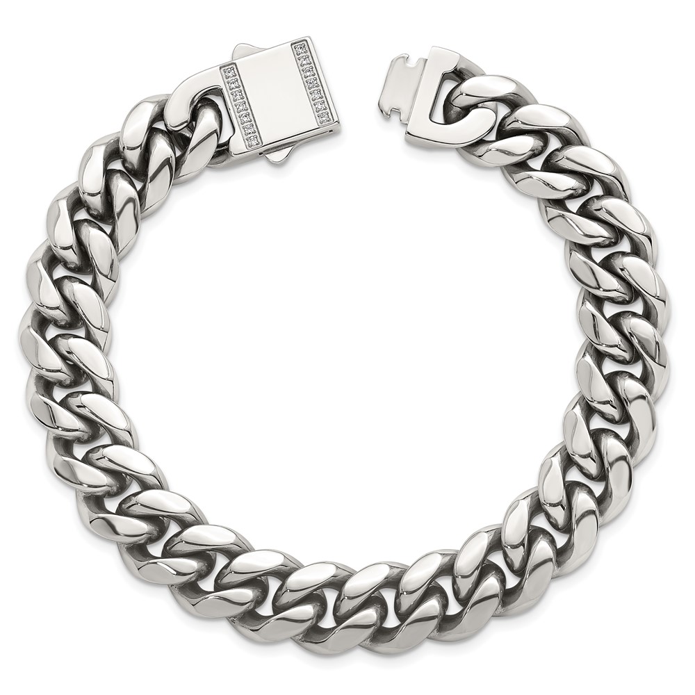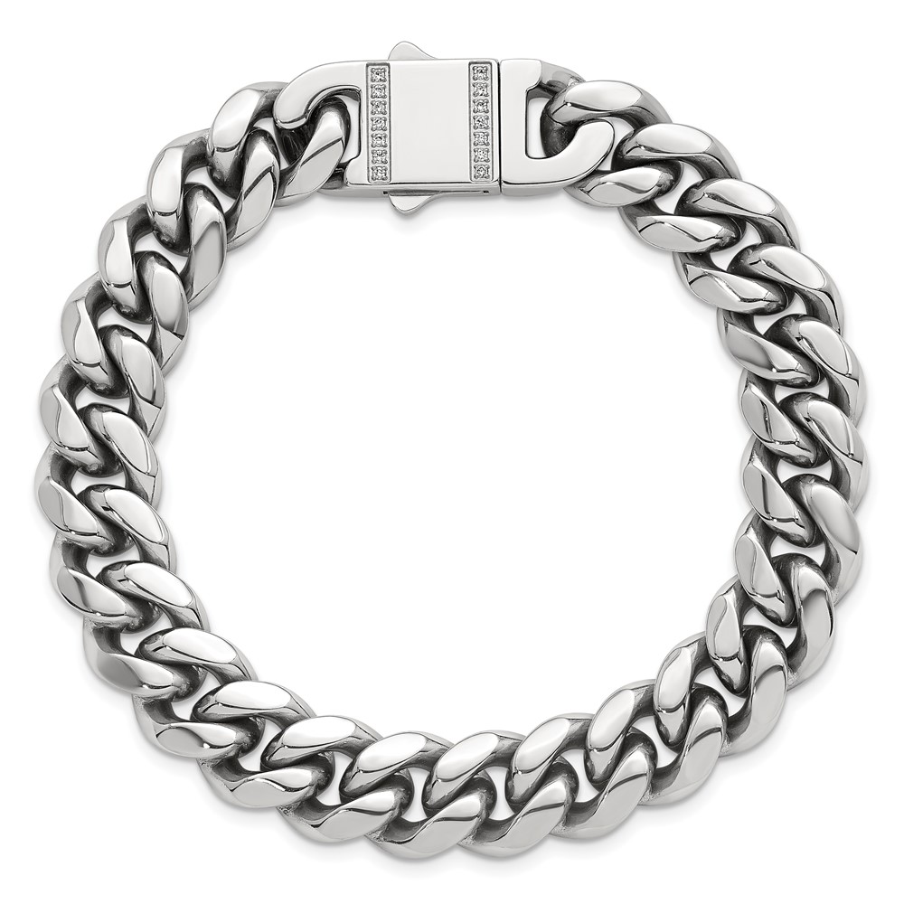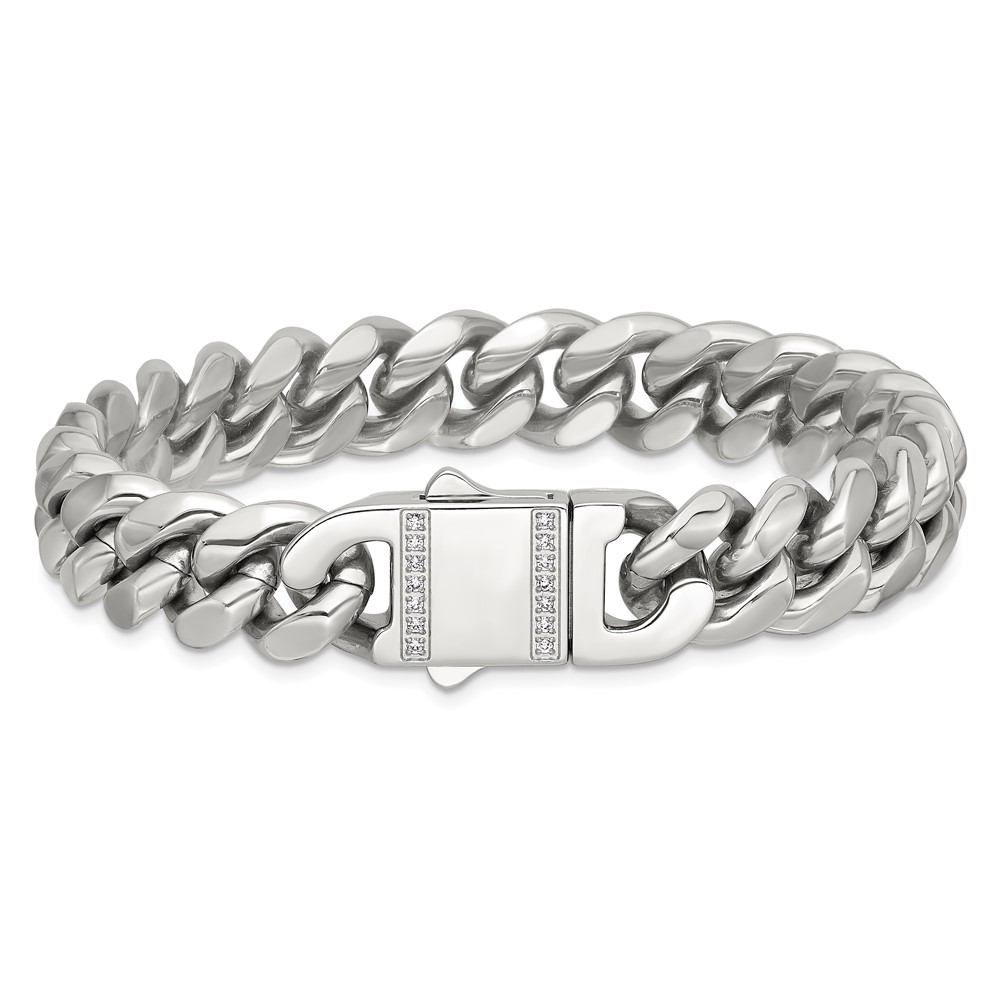 Stainless Steel Polished 12mm Curb Link w/CZ Clasp 8.25in Bracelet