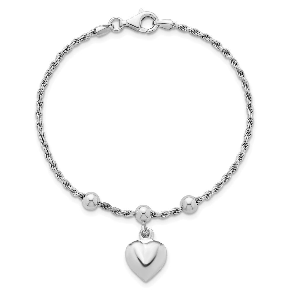 Sterling Silver Rhodium-plated Puffed Heart Dangle and Beads 7 inch Rope Chain Bracelet