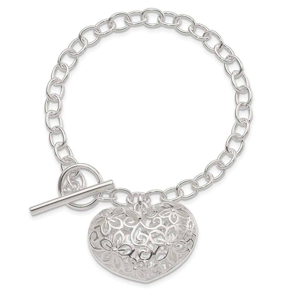 Sterling Silver Puffed Filigree Heart Toggle Bracelet