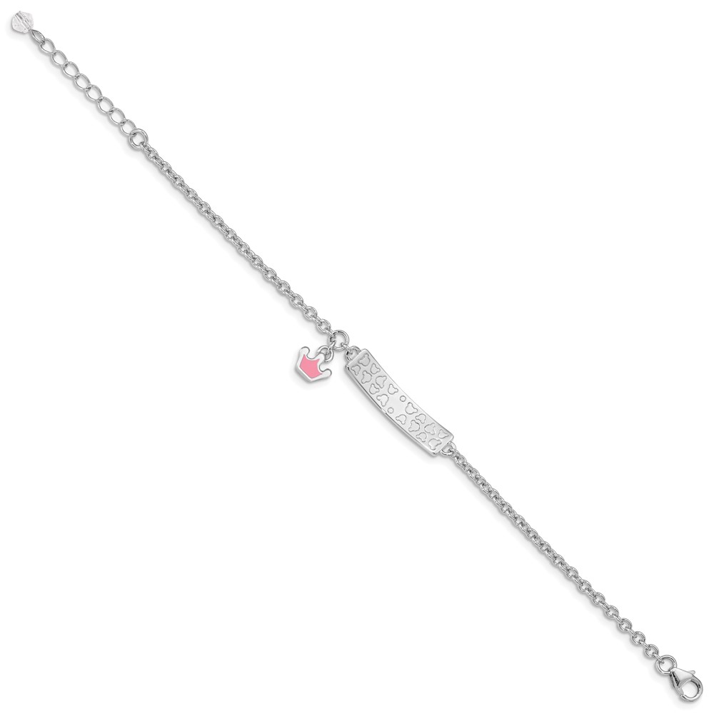 Sterling Silver Rhodium-plated Polished & Pink Enameled Crown with 1 Inch Extension Children's ID Bracelet
