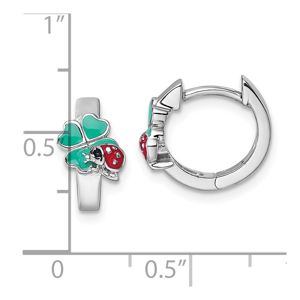 "Sterling Silver Rhodium-plated Children's Green, Red and Black Enamel Ladybug 4-Leaf Clover Hinged Hoop Earrings"