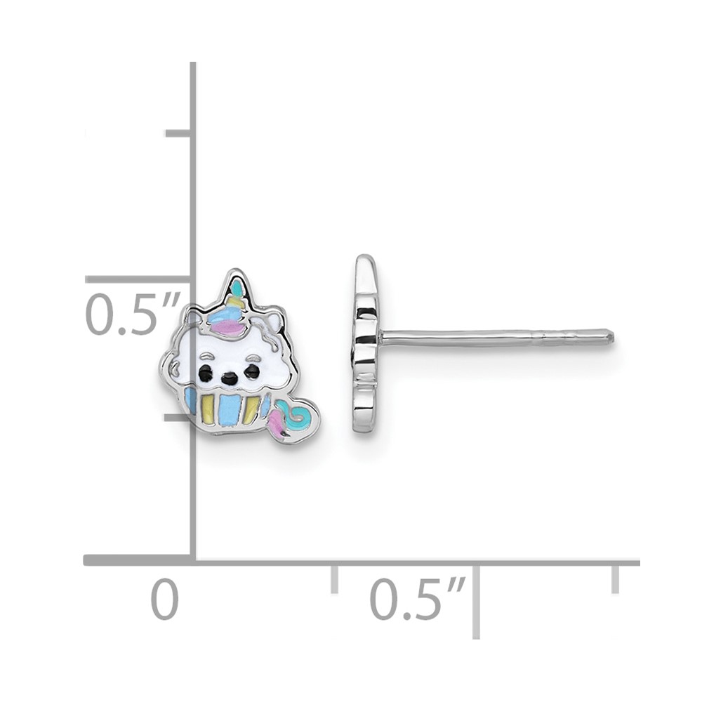 Sterling Silver Rhodium-plated Polished White and Rainbow Enamel Unicorn Cupcake Childrens Post Earrings