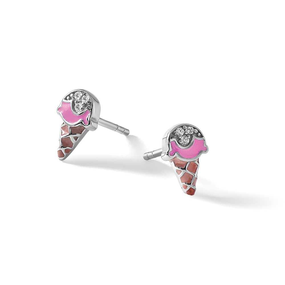 Sterling Silver Rhodium-plated Children's Pink and Brown Enamel with CZ Ice Cream Cone Post Earrings