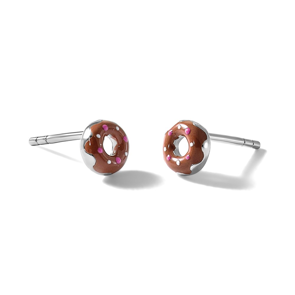 Sterling Silver Rhodium-plated Children's Brown with Pink and White Enamel Sprinkled Donut Post Earrings