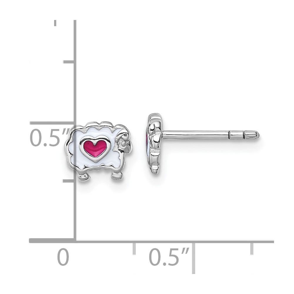 Sterling Silver Rhodium-plated Children's White and Pink Enamel Sheep with Heart Post Earrings