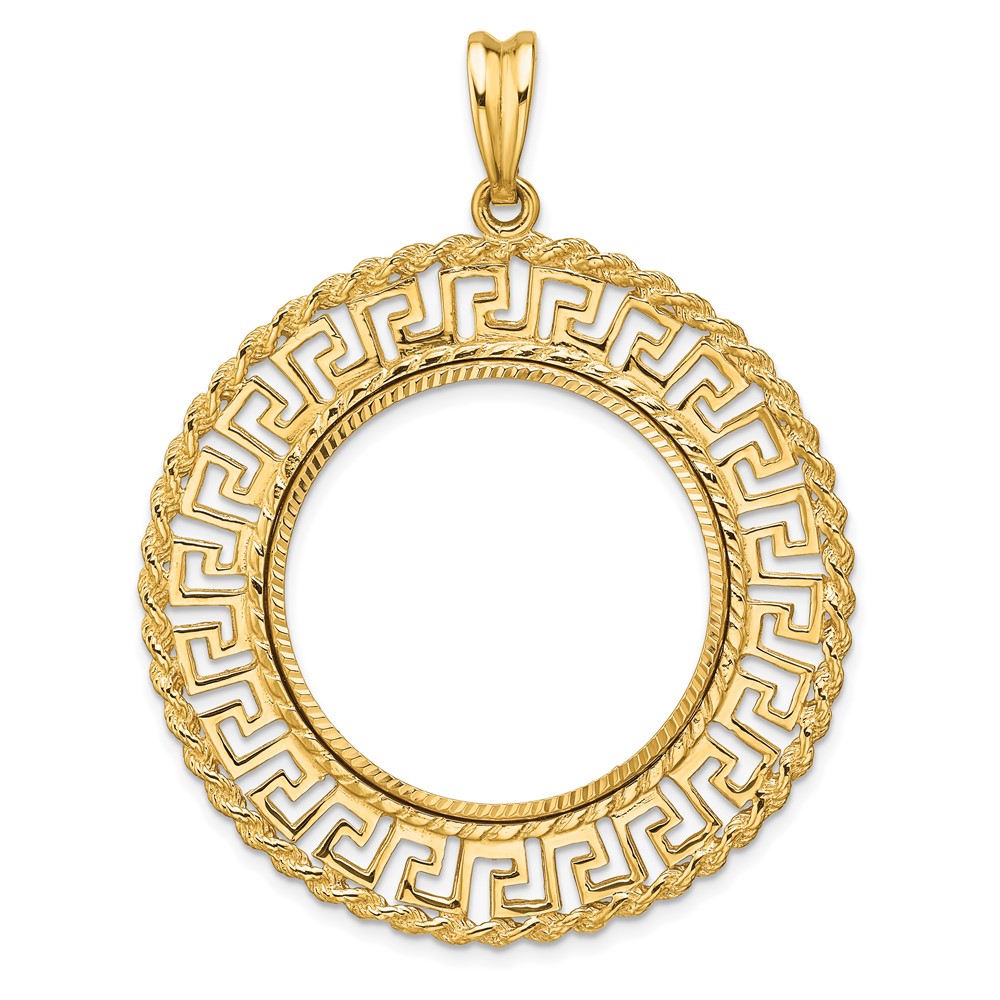 Wideband Distinguished Coin Jewelry 14k Polished and Diamond-cut Greek Key with Rope Border 27.0mm Prong Coin Bezel Pendant