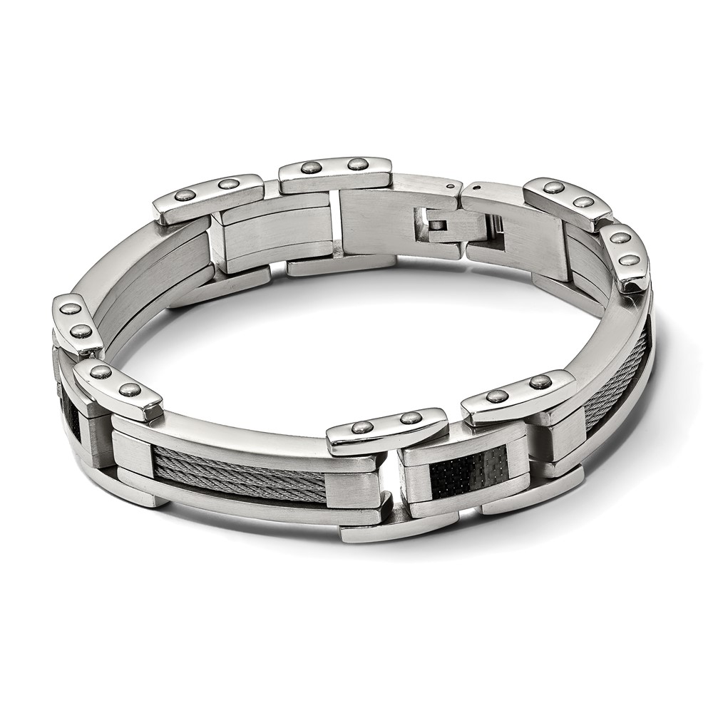 Chisel Stainless Steel Polished with Cable and Black Carbon Fiber Inlay 8.75 inch Link Bracelet