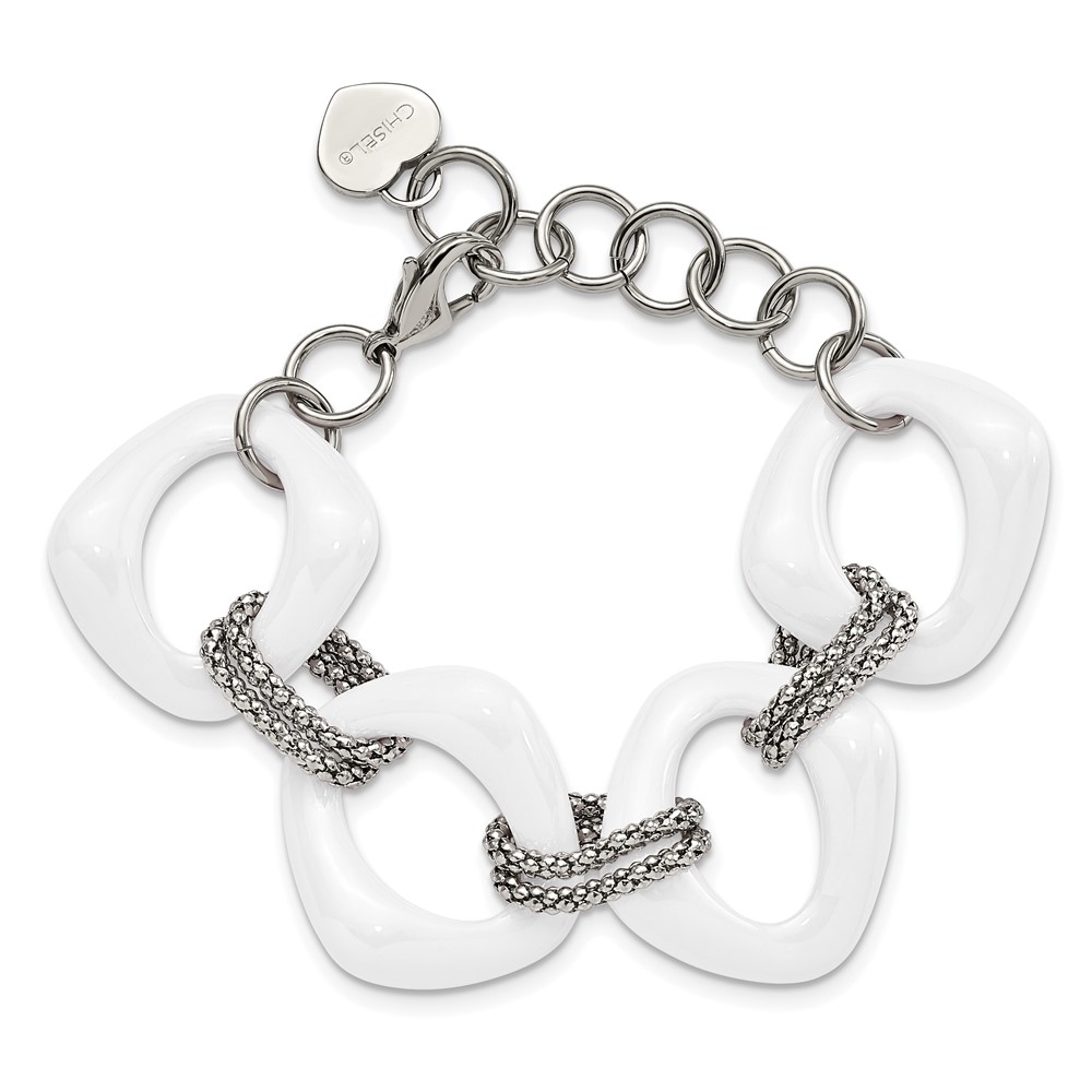 Chisel Stainless Steel Polished with White Ceramic 8 inch Open Link Bracelet