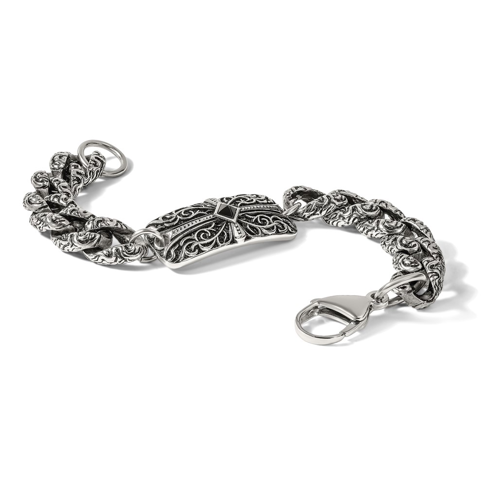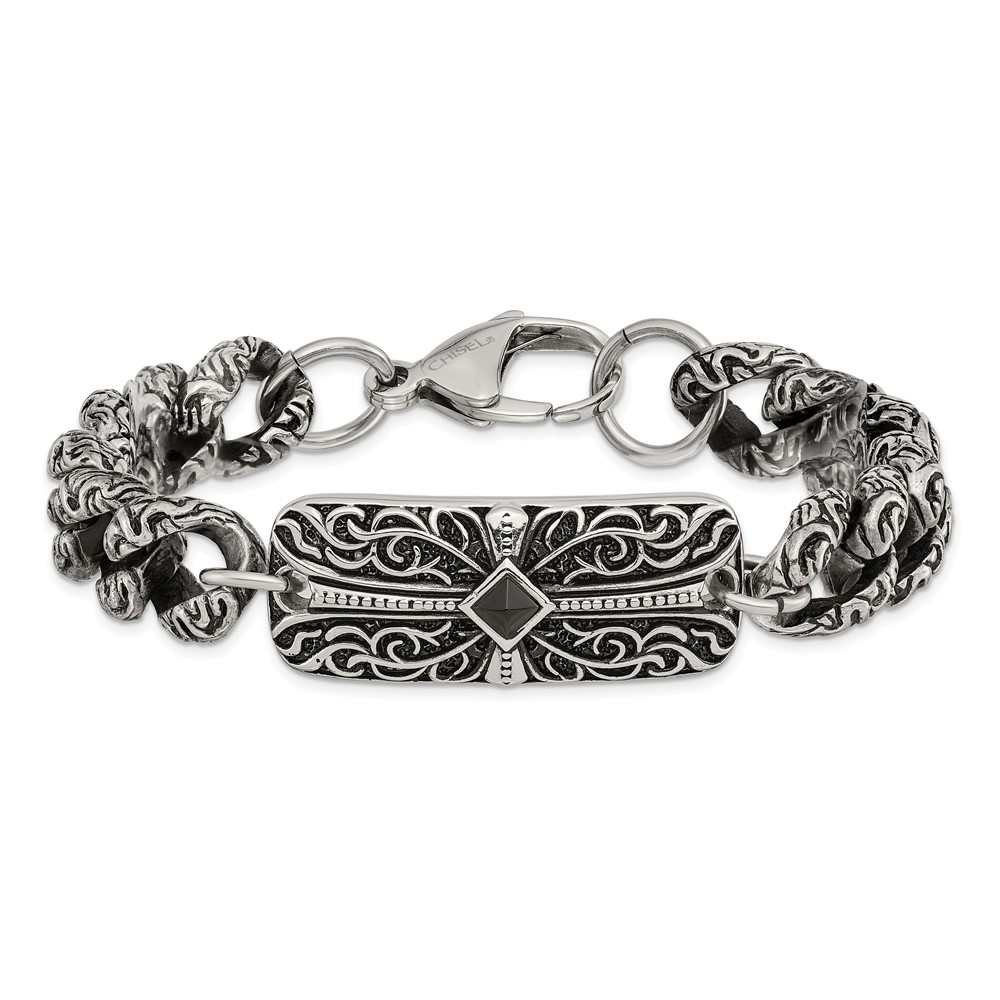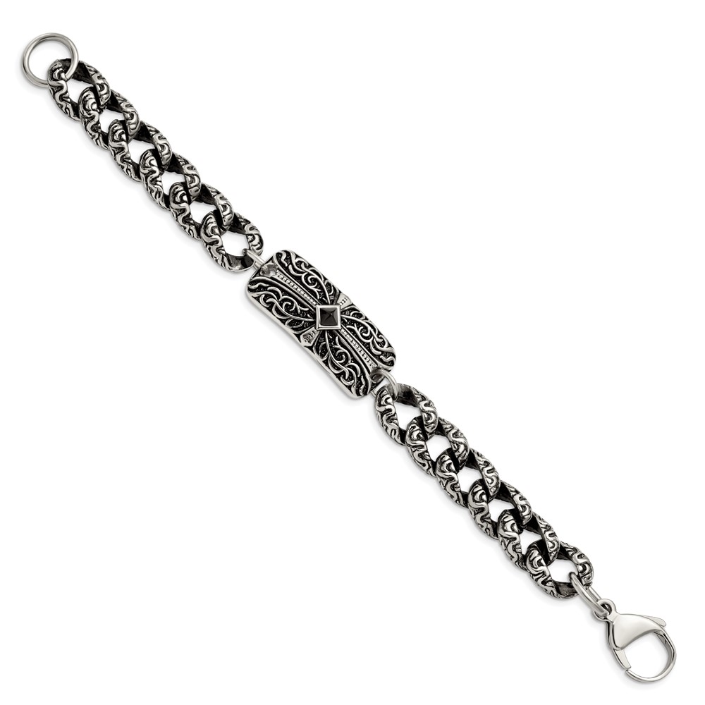 Chisel Stainless Steel Antiqued and Polished with Black Agate 9 inch Fancy Link Cross Bracelet
