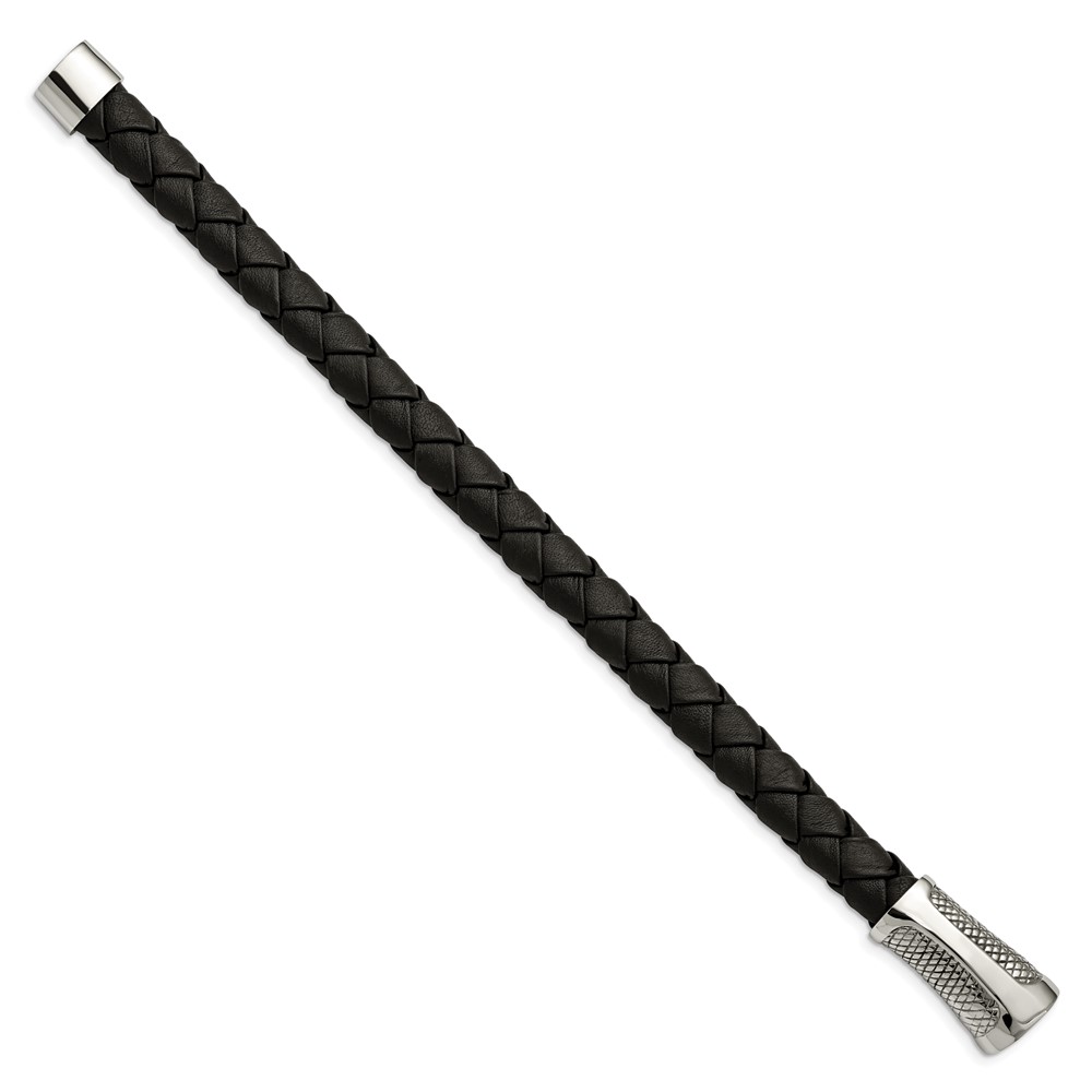Chisel Stainless Steel Polished and Textured Black Braided Leather 8.5 inch Bracelet