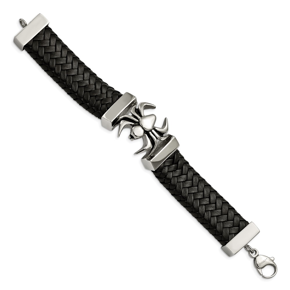 Chisel Stainless Steel Antiqued and Polished Spider Black Braided Leather 8.5 inch Bracelet
