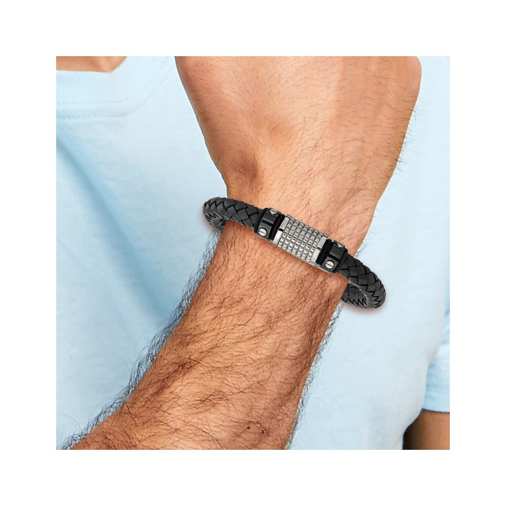 Chisel Stainless Steel Polished and Textured Black IP-plated Black Braided Leather and Rubber 8.5 inch Bracelet