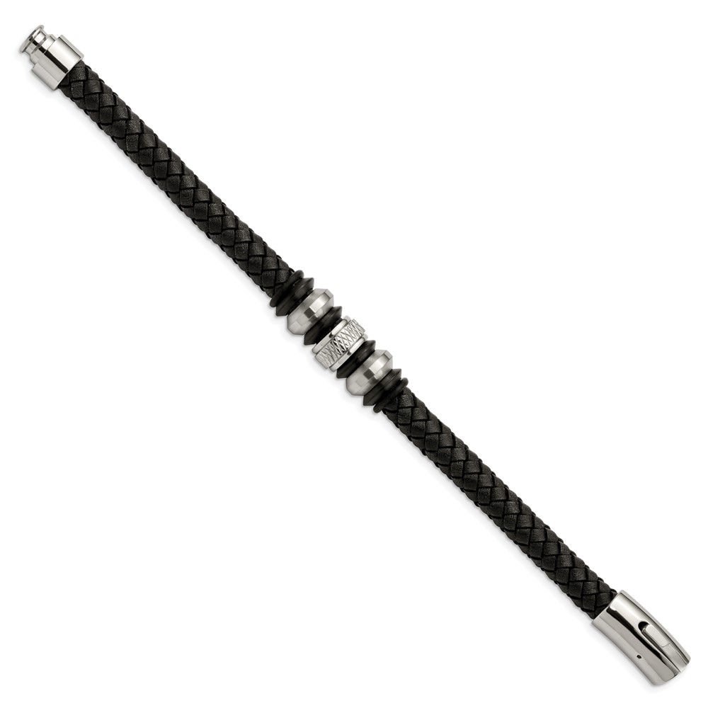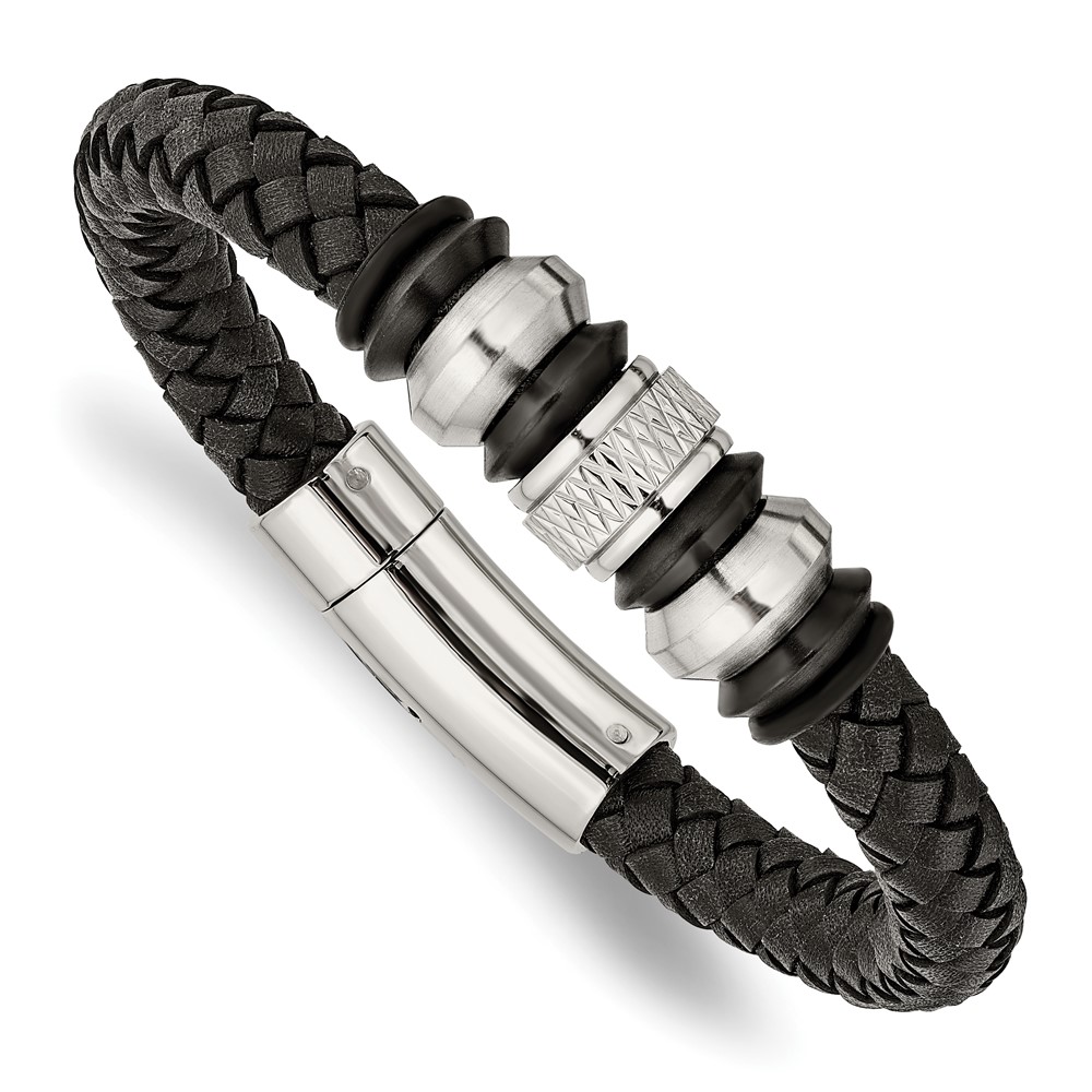 Chisel Stainless Steel Brushed Polished and Textured Black IP-plated Black Braided Leather and Rubber 8.5 inch Bracelet