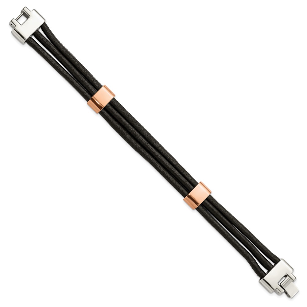 Chisel Stainless Steel Polished Rose IP-plated Multi Strand Black Leather 8 inch Bracelet