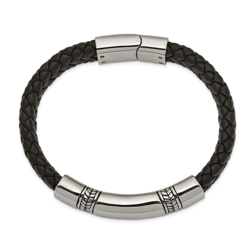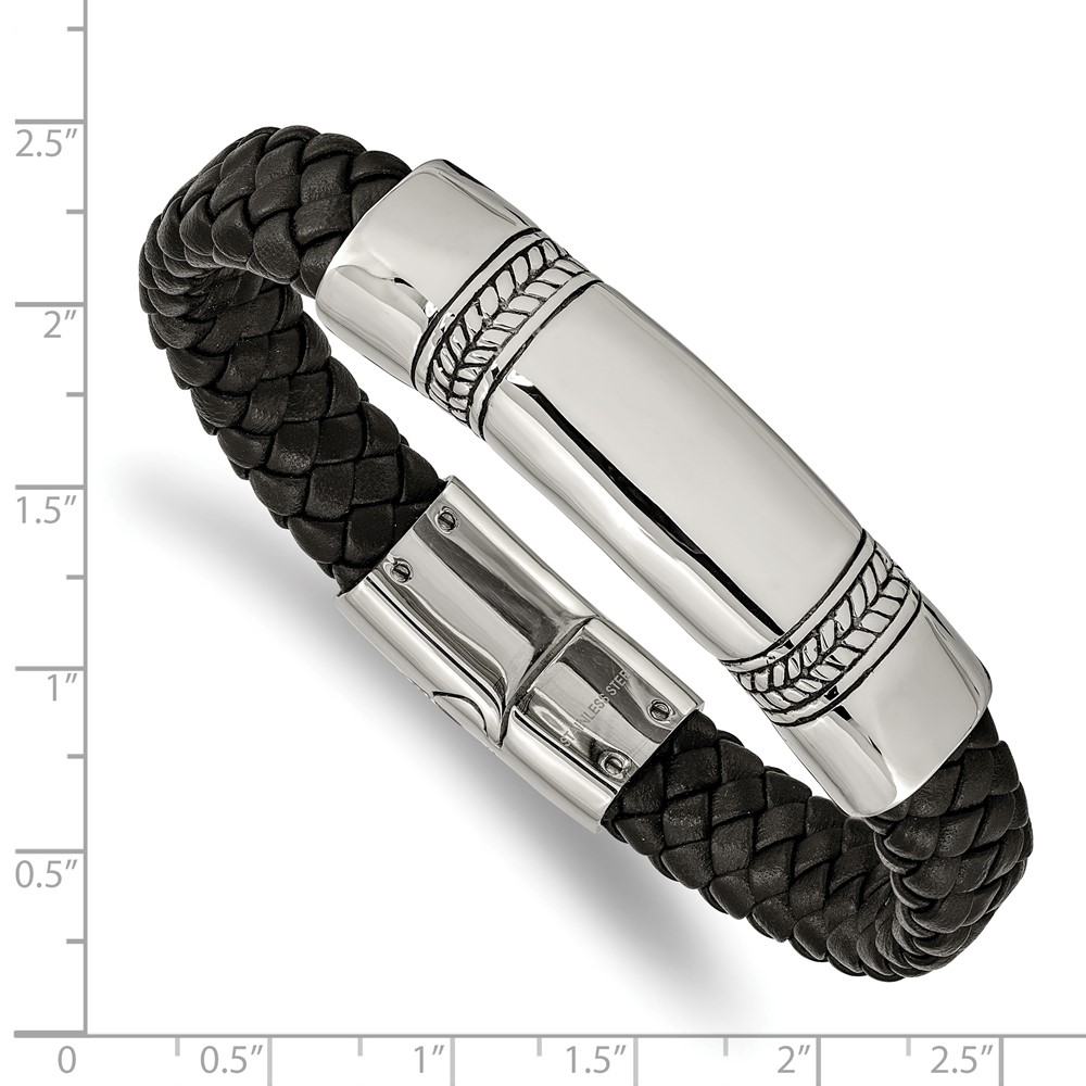 Chisel Stainless Steel Antiqued and Polished Braided Black Leather 8.25 inch ID Bracelet
