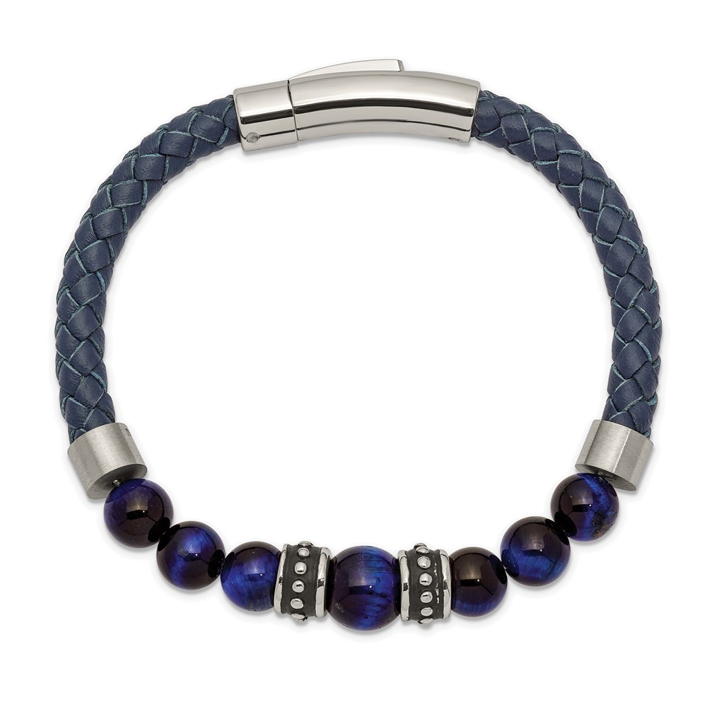 Chisel Stainless Steel Antiqued and Polished Blue Tiger's Eye Beads Blue Leather 8.25 inch Bracelet