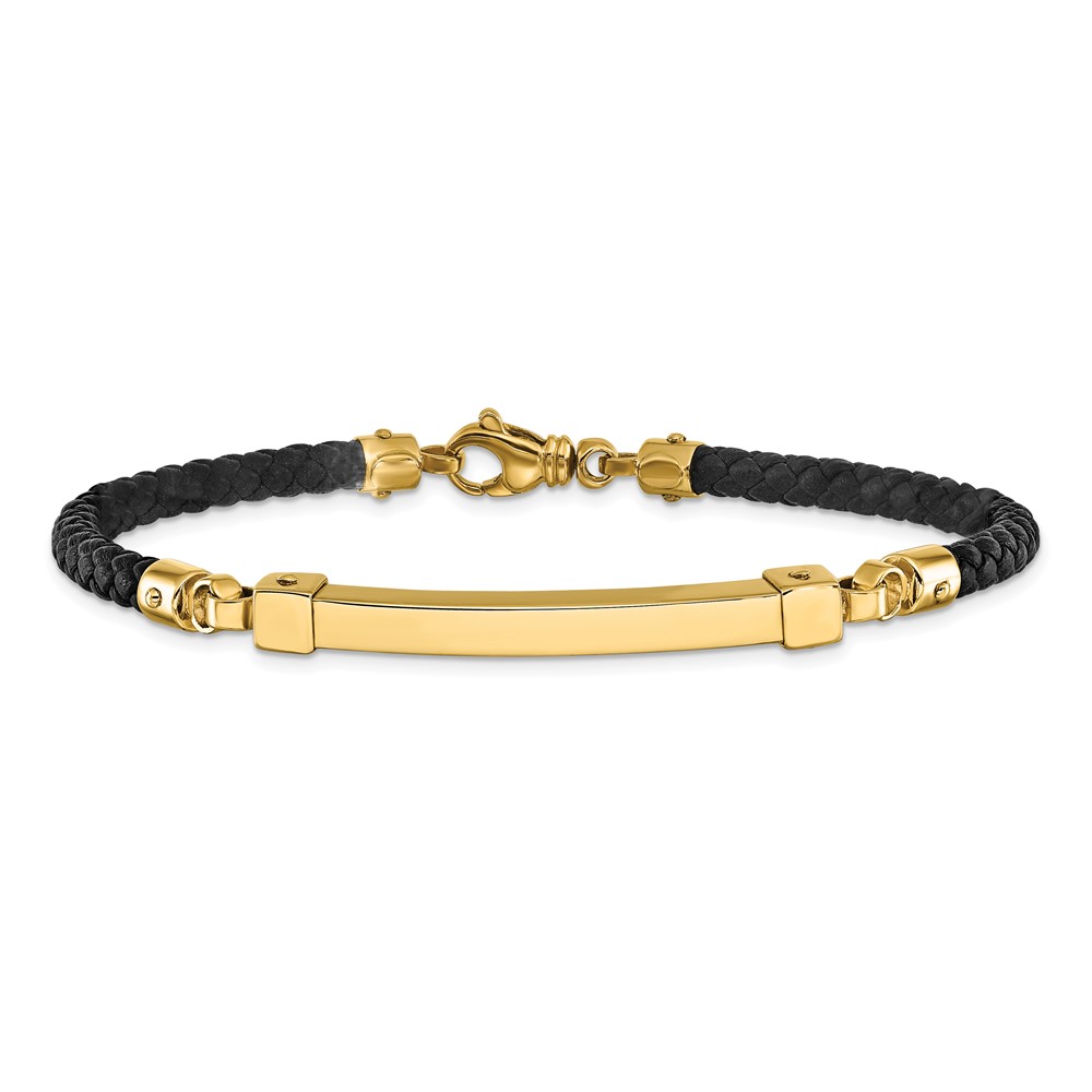 14K Polished 4mm Bar Braided Black Leather 8 inch Bracelet