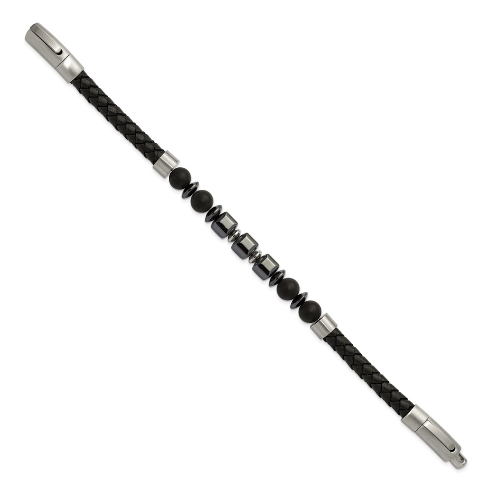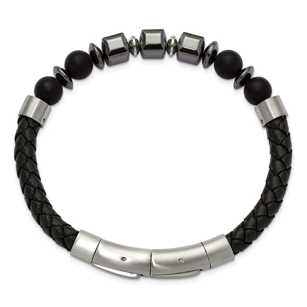 Chisel Stainless Steel Brushed Onyx and Hematite Beaded Black Leather 8 inch Plus .5 inch Extension Bracelet