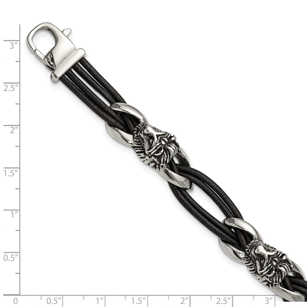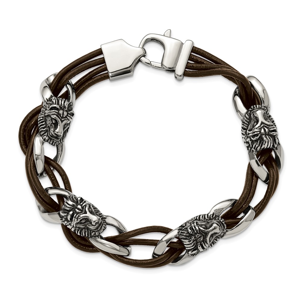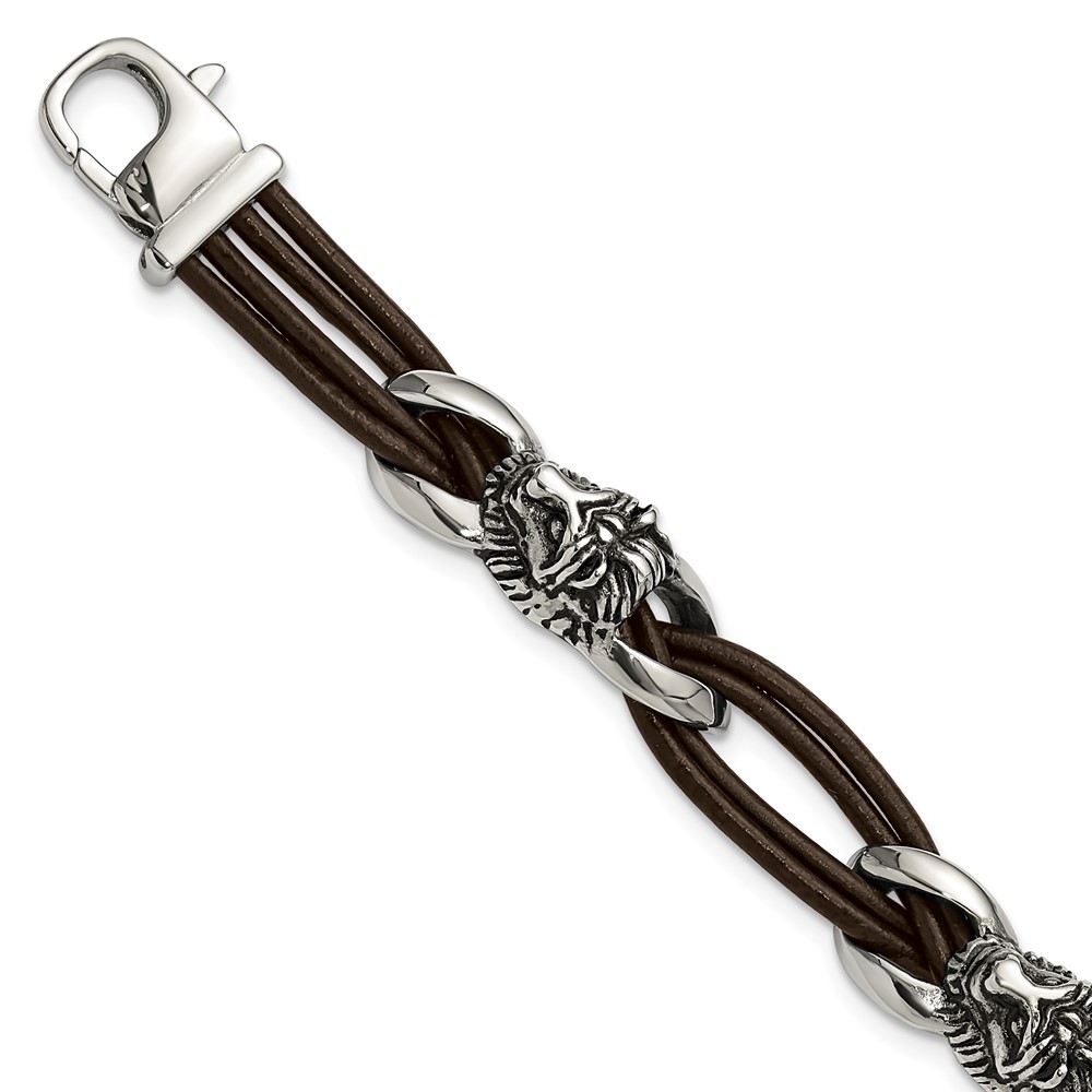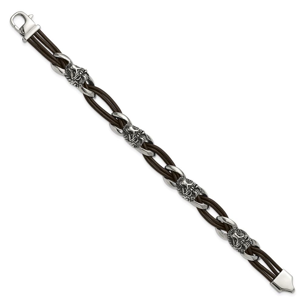 Chisel Stainless Steel Antiqued and Polished Lion Head Dark Brown Leather 8.5 inch Bracelet