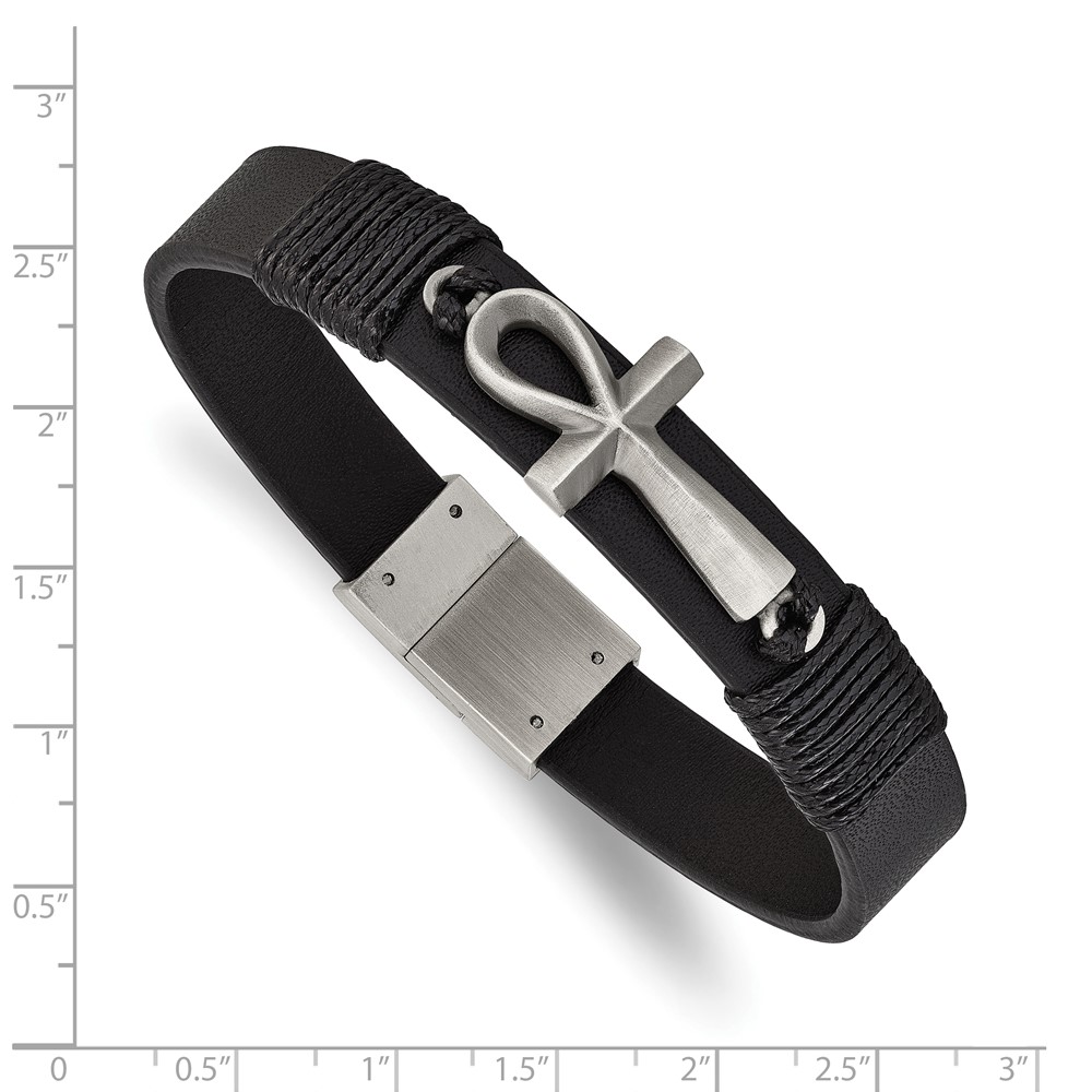 Chisel Stainless Steel Antiqued and Brushed Ankh Cross Black Leather 8.5 inch Bracelet