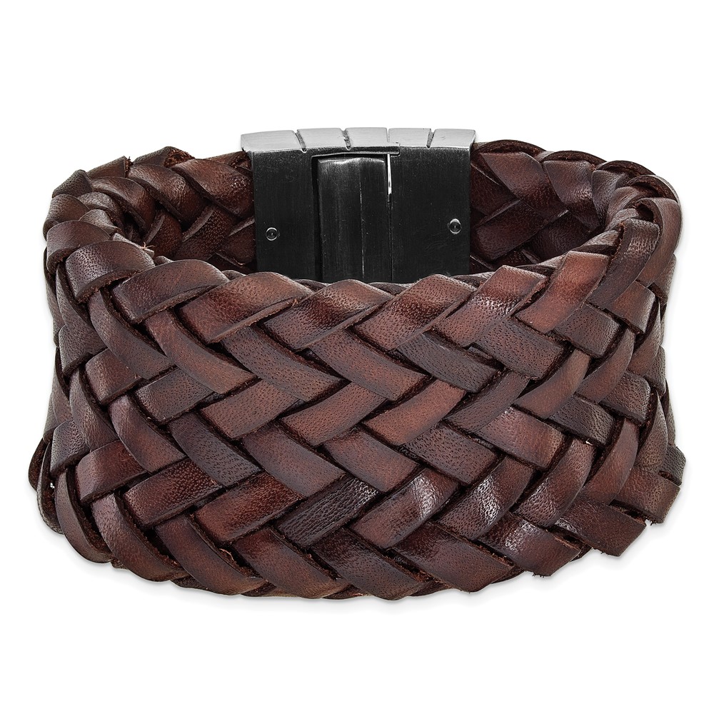 Stainless Steel Brushed & Brown Italian Woven Leather Bracelet
