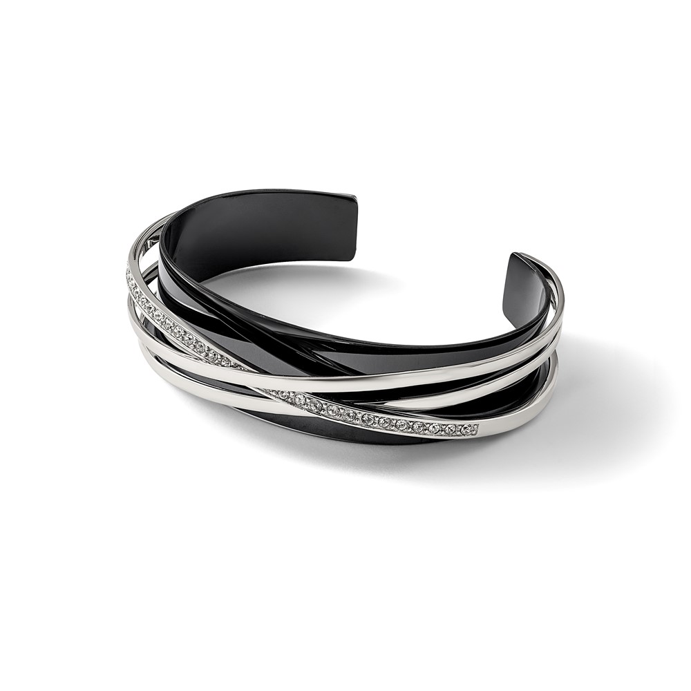 Chisel Stainless Steel Polished Black IP-plated with Crystals Layered Cuff Bangle