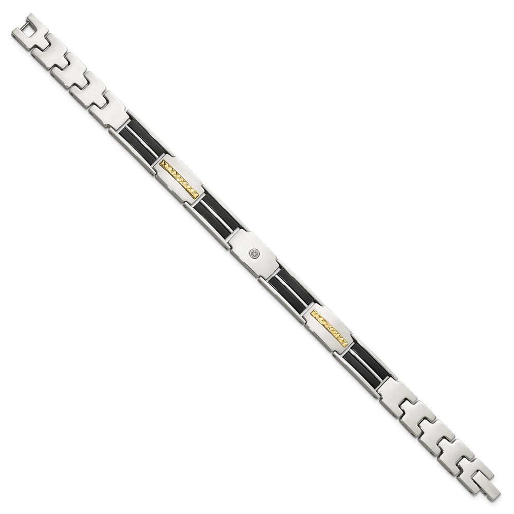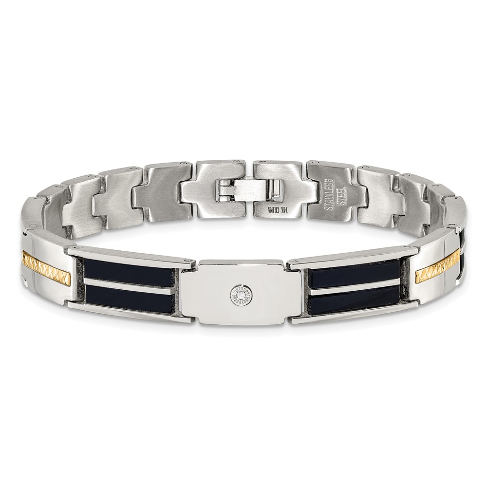 Chisel Stainless Steel Polished with Diamond-cut 14K Gold Accent and 1/20ct. Diamond with Black Enamel 8 inch Bracelet