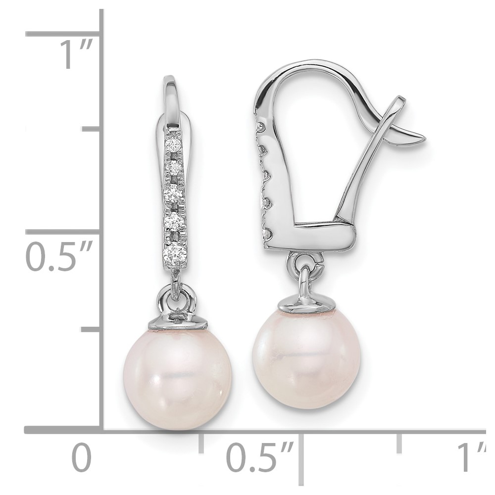 14k White Gold 6-7mm White Round Akoya Saltwater Cultured Pearl and .085 Carat Diamond Dangle Earrings