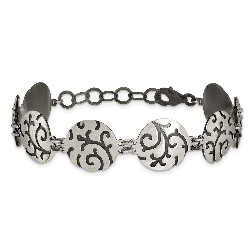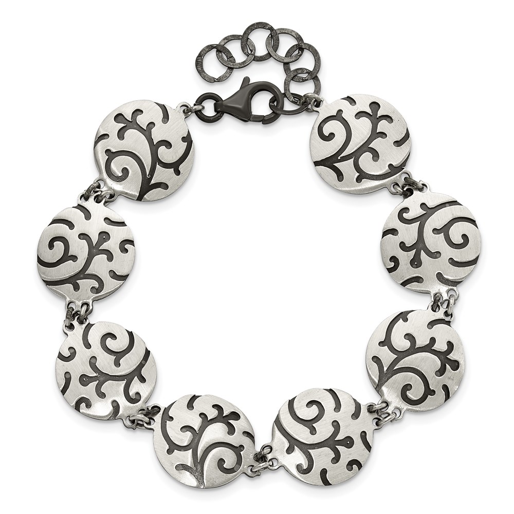 Sterling Silver Brushed Oxidize Burnished Swirl Disc w/1 in Ext. Bracelet