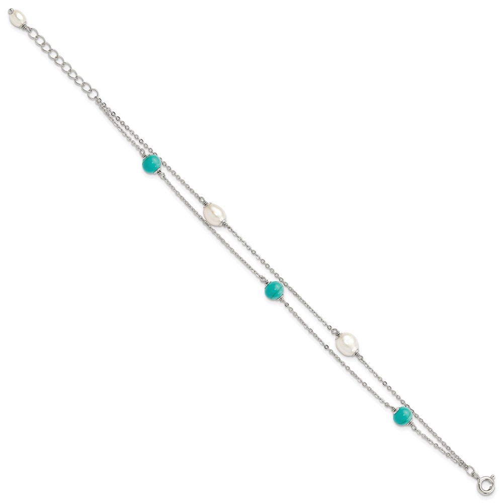 Sterling Silver Rhodium-plated Turquoise/FWC Pearl w/1in Ext Bracelet