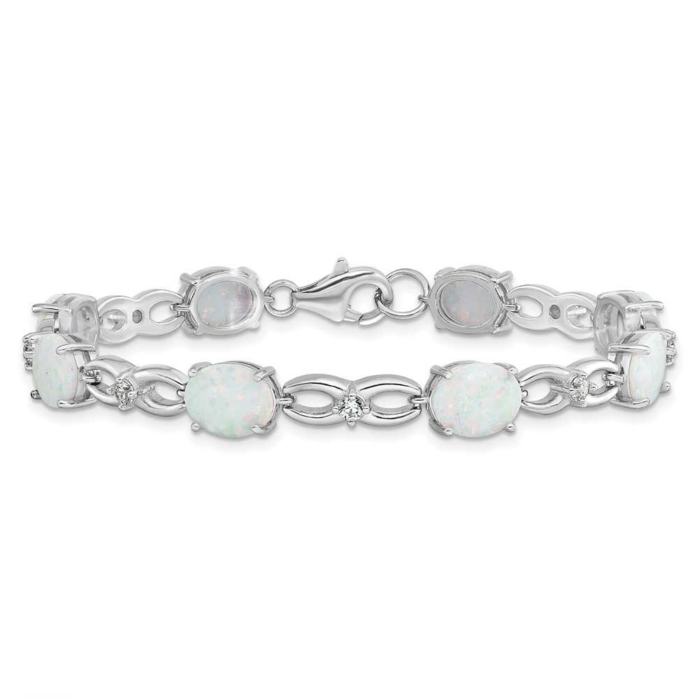 Sterling Silver Rhodium-plated Polished White Created Opal & CZ Bracelet