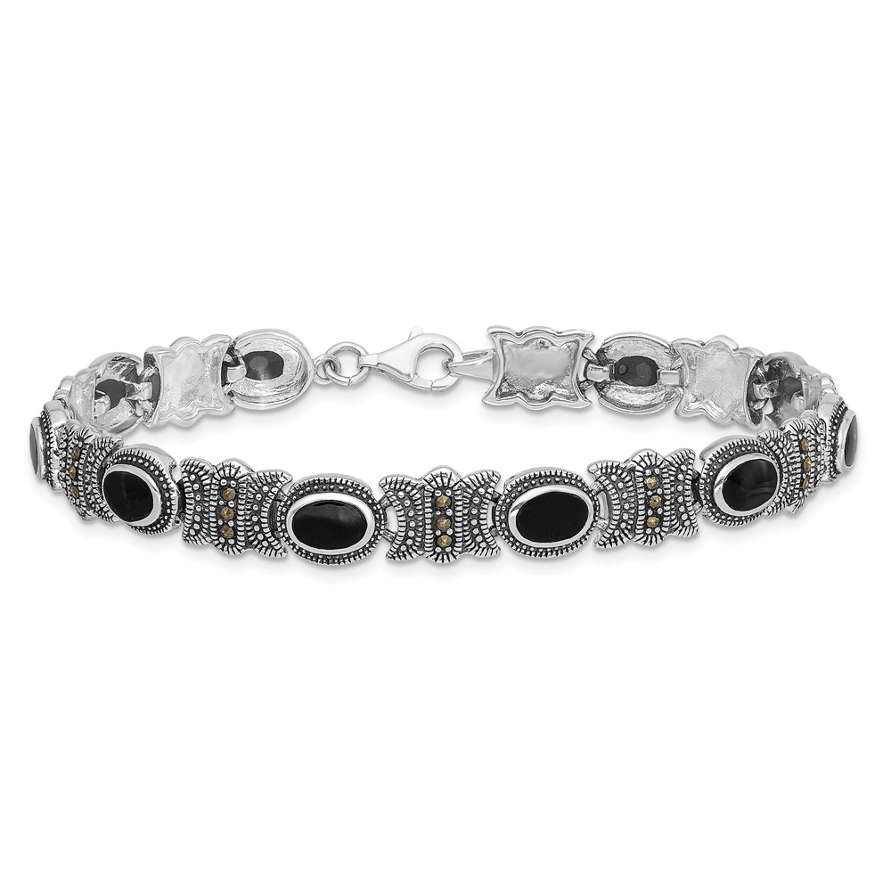 Sterling Silver Rhodium-plated Marcasite and Onyx 7.25 inch Bracelet