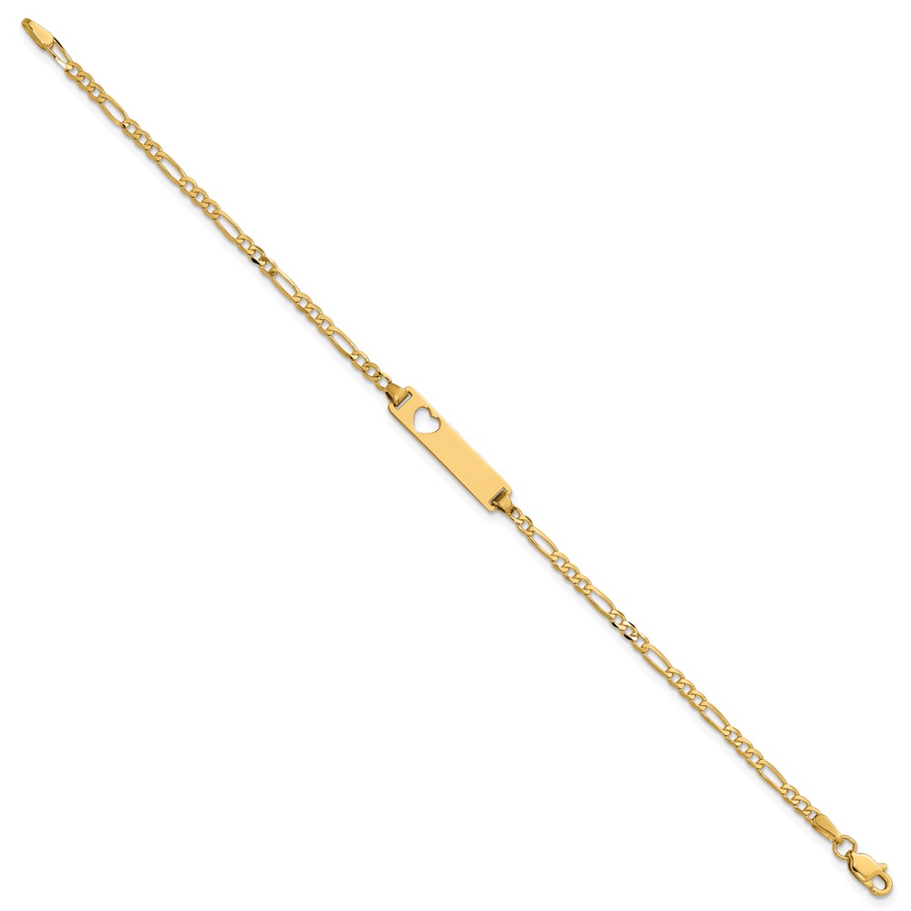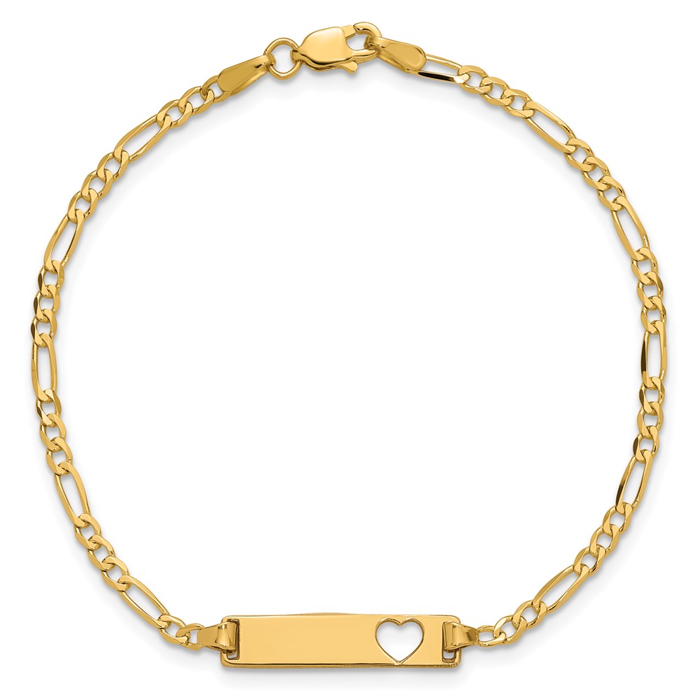 14k Polished Solid Chain/Solid Plate Figaro Link Cut-out Heart 20x5mm Plate 7 inch ID Bracelet