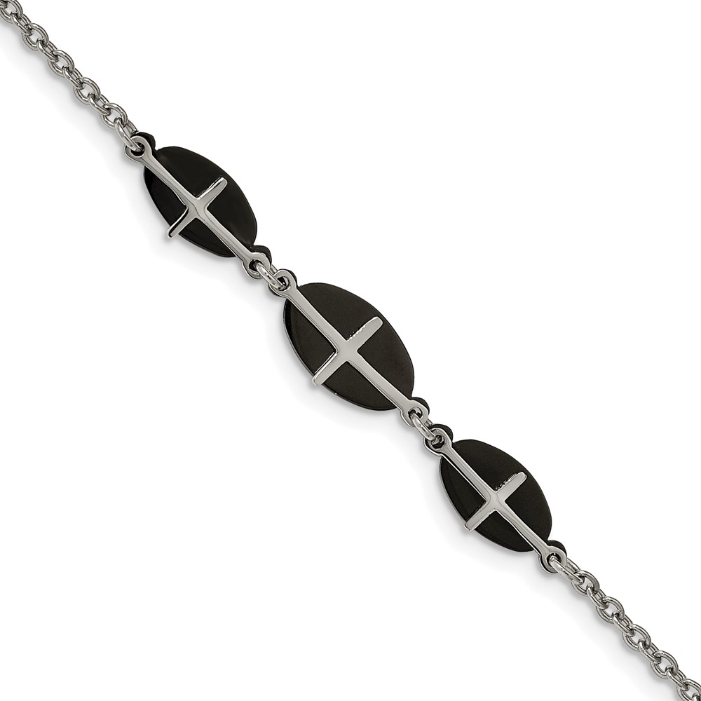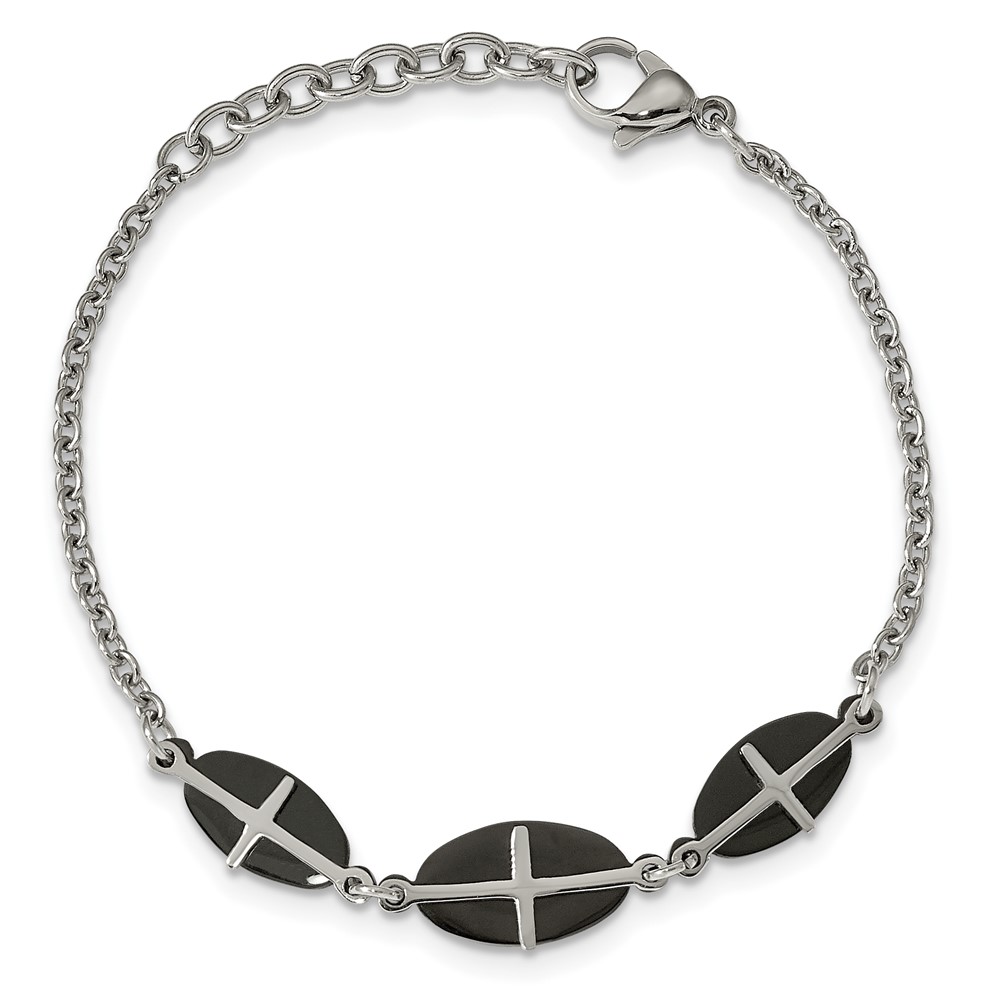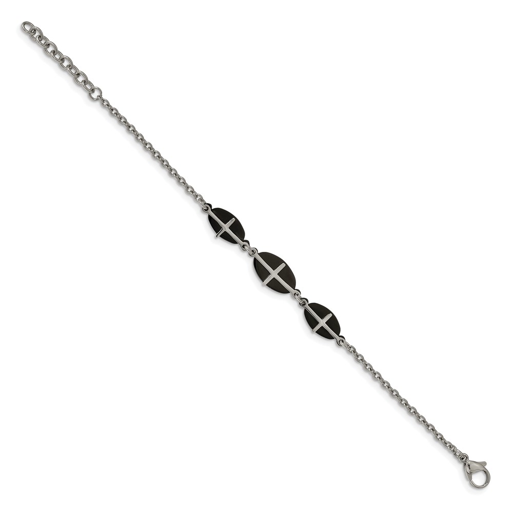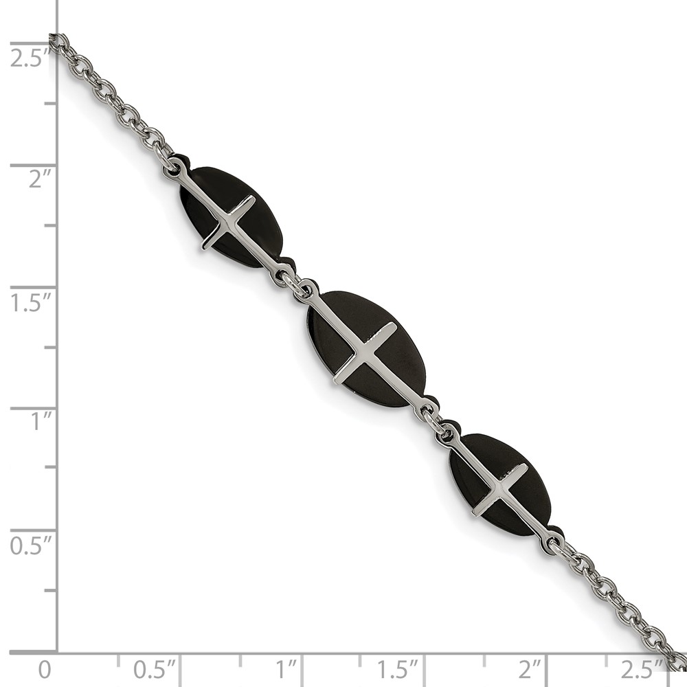Stainless Steel Polished Black IP-plated 7in w/1in ext. Cross Bracelet
